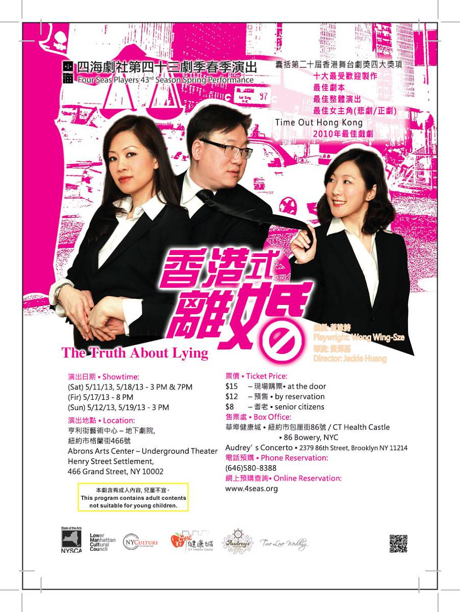 The Truth About Lying won Best Script Award at the 2011 Hong Kong Drama Awards. The play is a penetrating examination of marriage break-ups by one of Hong Kong’s most talented young playwrights, Wong Wing-sze. The award-winning play follows Emily, as she joins a small legal firm specializing in divorce law. The firm’s two partners are a husband and wife duo, and Emily proceeds to begin an affair with one as her relations deteriorate with the other. Playwright Wong’s sharp, insightful look at this complex situation is both profound and thought-provoking.