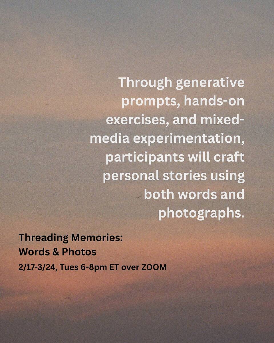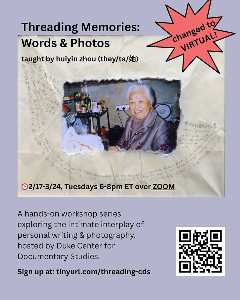 CAO Collective’s co-parent huiyin zhou is teaching a 6-week workshop series, Threading Memories: Words & Photos. Participants are asked to bring at least 3-6 physical photos from personal/family archives (or found images), along with a guiding question related to memory.
