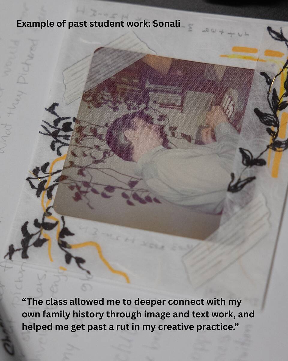 Through generative prompts, hands-on exercises, and mixed-media experimentation, participants will craft personal stories using both words and photographs. Students will look closely at artists whose work interweaves personal writing with photography, engaging topics such as queer kinship, diaspora, ancestry, grief, memory, social justice, & others shaped by student interest.