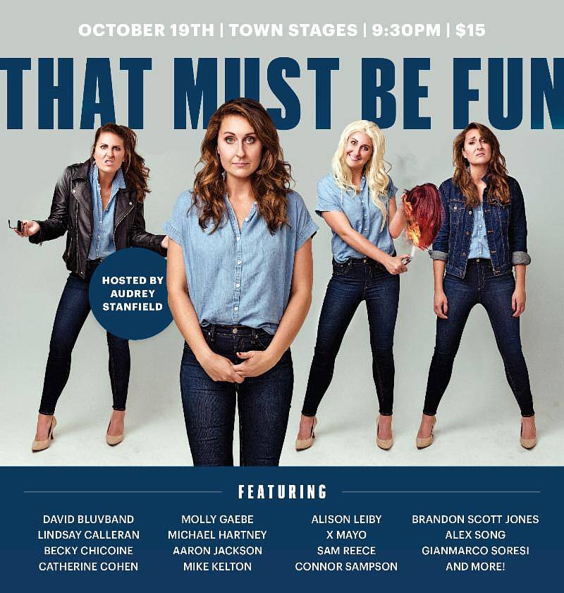 Town Stages presents That Must Be Fun, an evening of comedy to raise awareness for mental health, hosted by Audrey Stanfield on Friday, October 19, 2018 at 9:30pm at Town Stages, 221 West Broadway, NYC. The show features David Bluvband, Lindsay Calleran, Becky Chicoine, Catherine Cohen, Molly Gaebe, Michael Hartney, Aaron Jackson, Mike Kelton, Alison Leiby, X Mayo, Sam Reece, Connor Sampson, Brandon Scott Jones, Alex Song, Gianmarco Soresi, and more! Tickets are $15 and can be purchased at https://www.eventbrite.com/e/that-must-be-fun-tickets-50863152057. Proceeds will be donated to Vibrant Emotional Health, NYC.