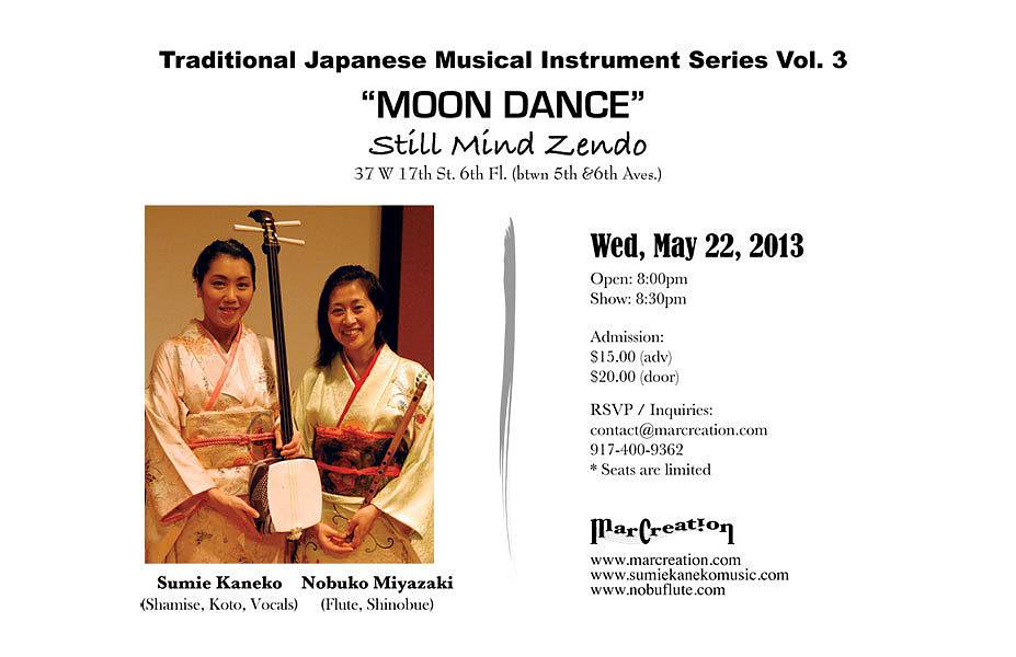 Traditional Japanese Musical Instrument Series vol. 3 Title: Tsukumai (moon dance) Artists: Sumie Kaneko (shamisen, koto, vocals), Nobuko Miyazaki (shinobue, flute) Date: Wednesday, May 22, 2013 Open: 8:00PM / Show: 8:30PM Venue: Still Mind Zendo Address: 37 West 17th Street, 6 Floor (btwn 5th and 6th Aves.) New York, NY 10011 Map: http://goo.gl/maps/nqSo9 Admission: $15.00 (advance), $20.00 (door) RSVP: contact@marcreation.com / 917-400-9362 Program: 1. Tsukuyomi -Nobuko Miyazaki (2011) 2. Camera - Nobuko Miyazaki (2011) 3. Evergreen - Sumie Kaneko (2011) 4. Five and Thirteen are Prime Numbers - John Kaizan Neptune (1983) -intermission- 5. Sakuragari (Cherry Blossom Viewing) - Kengyo Yamada (approx. 1804-1818) 6. Haru no Umi (Spring Sea) - Michio Miyagi (1930) 7. Hana (Fabulous) - Tadao Sawai (1976) Related links: Sumie Kaneko: http://www.sumiekanekomusic.com/ Nobuko Miyazaki: http://www.nobuflute.com/ Mar Creation, Inc.: http://marcreation.com/