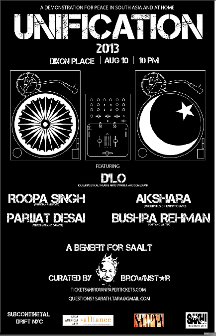 A DEMONSTRATION FOR PEACE IN SOUTH ASIA & AT HOME Featuring performances by: Bushra Rehman Parijat Desai D'Lo Roopa Singh Akshara and more…! Supporting South Asian Americans Leading Together (SAALT) Curated by THE BROWNSTAR REVOLUTION Saturday, August 10, 2013 Doors Open at 9:30 PM | Show Starts at 10 PM Dixon Place, 161A Chrystie St, New York, NY 10002 | http://dixonplace.org/ Purchase Tickets Until July 27th: $20 Early Bird | After July 27th $25 Online The fifth annual UNIFICATION is New York’s largest annual demonstration for peace in South Asia. Highlighting the talent of the South Asian American community, we celebrate the region’s first major victories in the anti-colonial movement and stand in solidarity for peace in the region. UNIFICATION 2013 is proud to once again support South Asian Americans Leading Together (SAALT) America’s leading South Asian advocacy organization! South Asian Americans Leading Together (SAALT) is a national, nonpartisan, non-profit organization that elevates the voices and perspectives of South Asian individuals and organizations to build a more just and inclusive society in the United States. SAALT is the only national, staffed South Asian organization that advocates around issues affecting South Asian communities through a social justice framework. SAALT’s strategies include conducting public policy analysis and advocacy; building partnerships with South Asian organizations and allies; mobilizing communities to take action; and developing leadership for social change. More at www.SAALT.org.