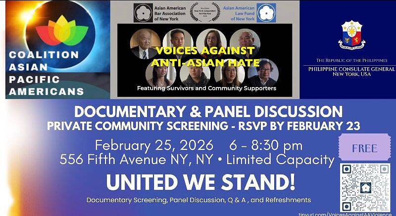 This event is organized by the Coalition for Asian Pacific Americans (CAPA), in partnership with the Asian American Bar Association of New York (AABANY) and the Asian American Law Fund of New York (AALFNY), and hosted by the Philippine Consulate General. The screening will be followed by a panel discussion on key issues surrounding hate crimes and anti-Asian bias, and a reception.