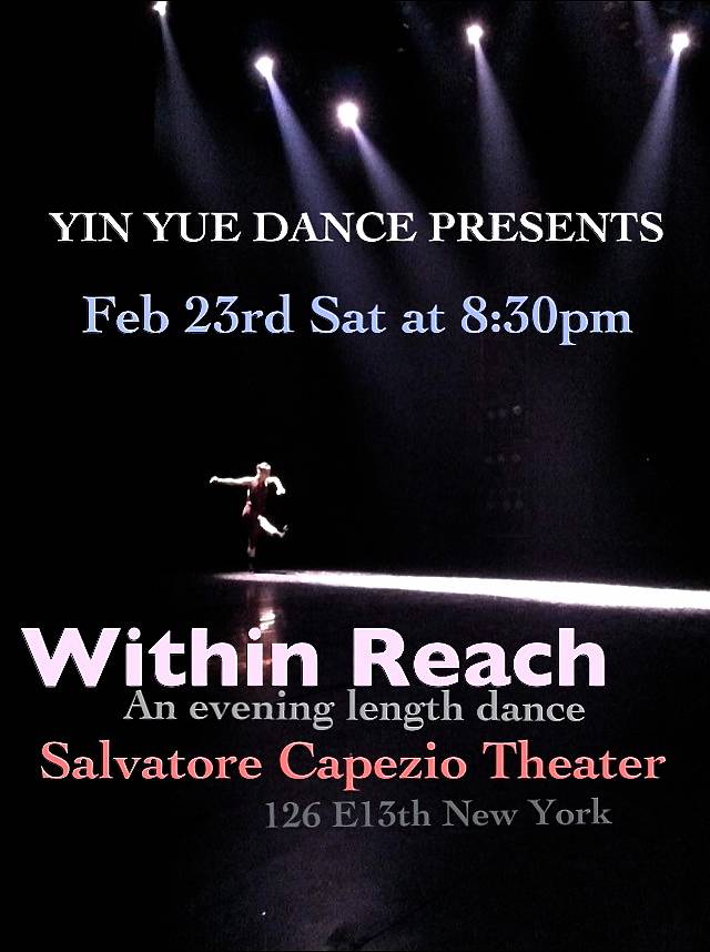 In this 60 min work titled Within Reach, I will produce and perform with the company members Sarah F. Parker, Grace Whitworth and Daniel Oliver, I will also present a newly created solo work. The dance was premiered in Jiangxi Performing Arts Center in Nanchang, Jiangxi Province, China on Jan 19th, 2013 and it was a great pleasure and opportunity to have the chance to present and share it with audience in New York City. The work is about distance. The distance in space, between people and also the distance in its metaphors. It is about the distance we can see and recognize, also the distance we can only feel. Time: Feb 23rd, Saturday, 8:30pm Location: Salvatore Capezio Theater at Peridance 126 East 13th street, New York, NY Ticket: $ 16 online at
