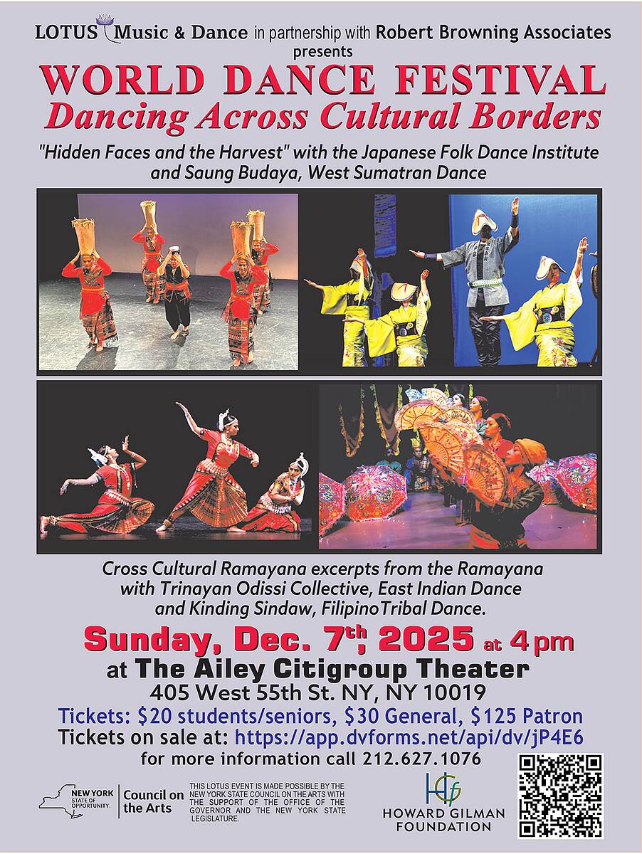 The annual World Dance Festival: Dancing Across Cultural Borders, presented by Lotus Music & Dance and Robert Browning Associates, will feature a culturally diverse, wide spectrum of unique expressions through music and dance.
