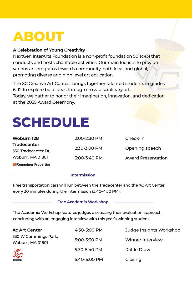 The XC Creative Art Contest brings together talented students in grades 6–12 to explore bold ideas through cross-disciplinary art. Today, they gather to honor their imagination, innovation, and dedication at the XCAC 2025 Award Ceremony.