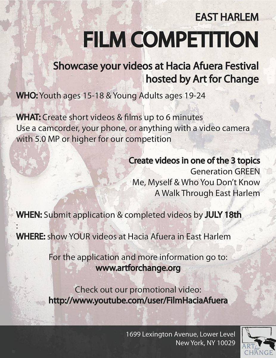 Generation GREEN Today we hear “green” everywhere and we want to hear what green means to you. This theme looks at the environment, conservation & sustainability. Why is it important & what needs to be done? Me, Myself & Who You Don’t Know We want to breakdown the stereotypes about youth and young adults in the media. Tell us about yourself and how you fit into your community. What defines you and makes you an individual? A Walk Through East Harlem We want to see East Harlem through your eyes. Tell us about what is important in your life about your experience in this neighborhood and community. What are the great things, the bad things, and what has changed? You do not have to live in East Harlem in order to compete!