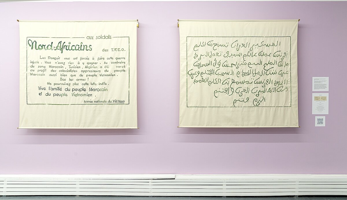 “Who is disinherited by the silences of overlapping wars of occupation in Indochina and North Africa? ” asks the work’s wall label. To the left is another work by Nguyen: two banners embroidered with parallel messages in French and Arabic hanging against a light purple wall. Translated from a propaganda leaflet from the 1940s and ‘50s, the text in Letters From the Other Side (2023) urges North African soldiers serving the French force to put down their arms against their oppressed brothers in their colonizer’s war: “Vive l’amitié du peuple Marocain et du peuple Vietnamien (Long live the friendship of the Moroccan and Vietnamese people).”