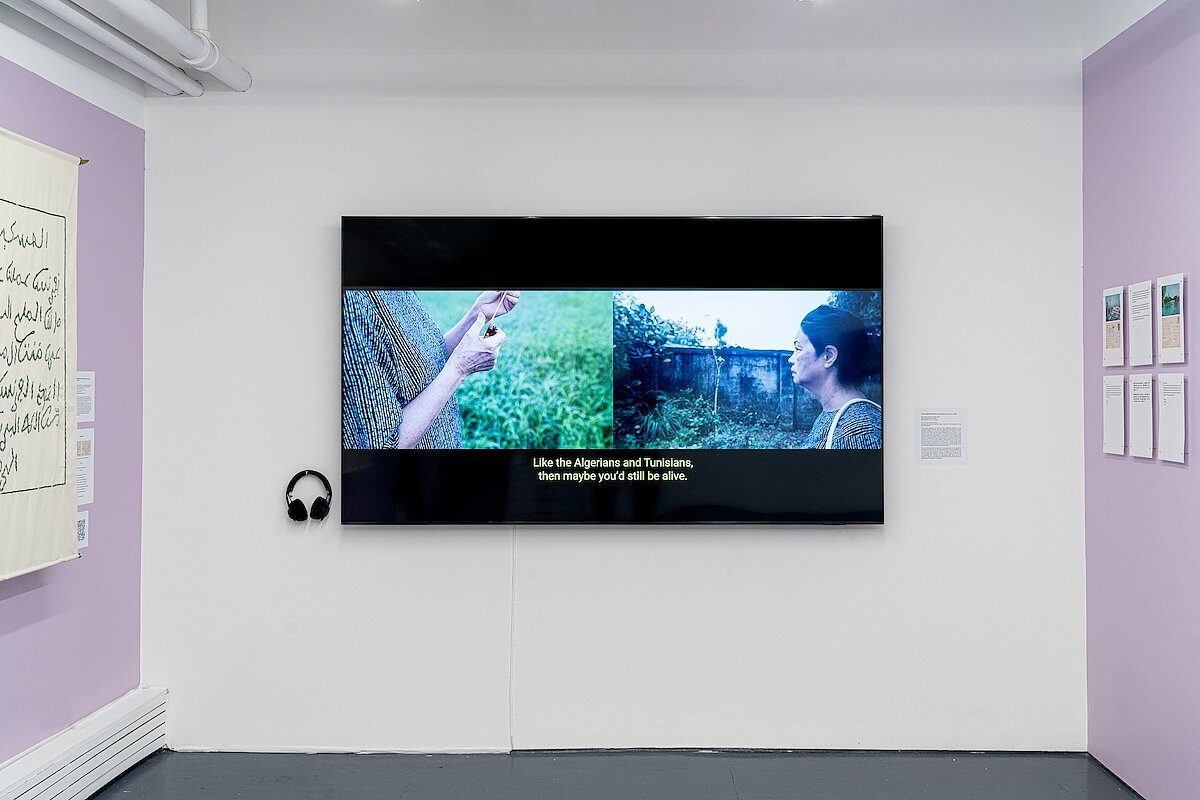 Credited by Goffe and Chong as the show’s inspiration, Tuan Andrew Nguyen’s 2023 film Because No One Living Will Listen sets the auditory tune for the exhibition. The two-channel video tells the story of a daughter searching for her father at the ruins of his memory. The narrative unfolds as the Vietnamese-Moroccan woman Habiba begins a letter to her Moroccan father in Vietnamese. Her father was one of many Moroccan soldiers who defected from the French colonial force during the first Indochina War and stayed in Vietnam.