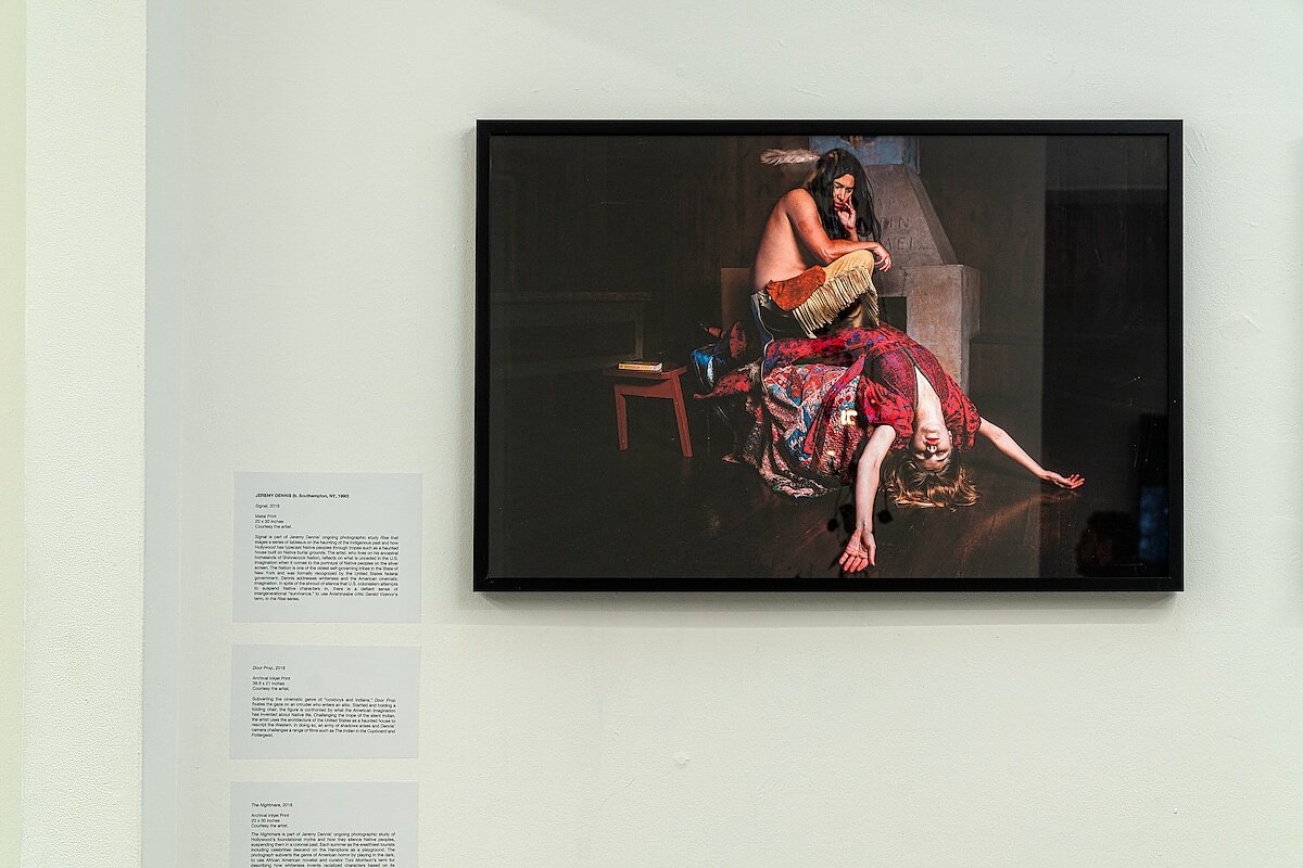 For Jeremy Dennis, silence appears as spectre; scenes of haunting pervade his work. The indistinct presence of Indigenous people in Dennis’s dark photographs trace a peculiar subversion, playing into the objectifying mystification of the Native American trope as the savage other. By staging the colonizer’s states of distress and fear in a theatrical center, Dennis’s work subverts the mystery back to its root. The result is a lingering sense of suspension—like weighted air under the memory of colonial violence, unacknowledged and illegible.