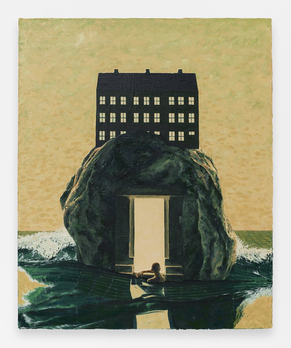 This thought came to me as I considered Ho Jae Kim’s House with an Ocean View (2023). It depicts a surreal scene. Surrounded on all sides by the ocean, a solid stone portal is encased by a boulder and topped by a black cutout of a house. The surface of the water carries a tiled pattern and crashes around the rock in frothy waves. A bald man, submerged beneath his chest in water, rests on the threshold of the gateway in a meditative pose, looking out into the blinding gold light before him.
