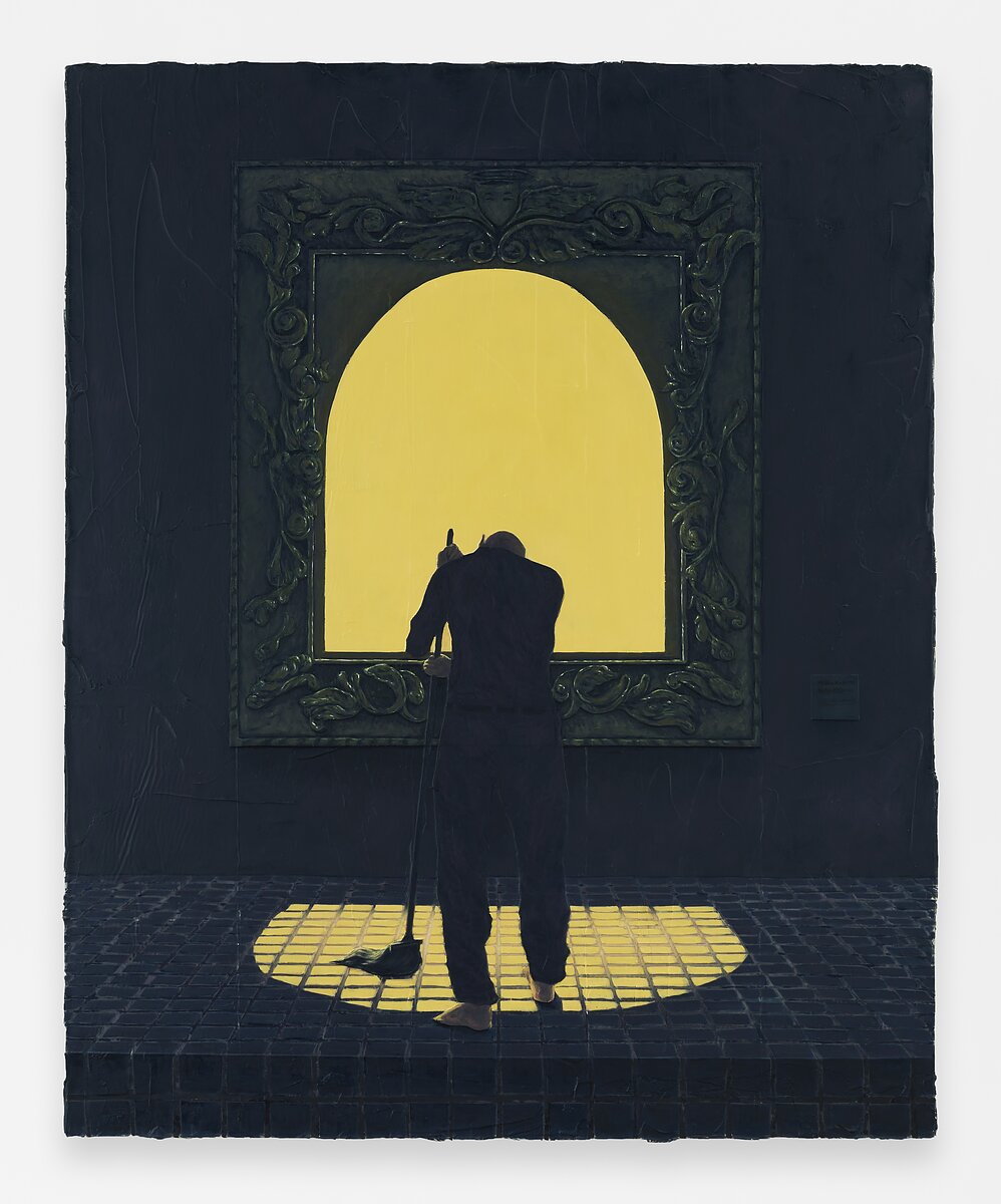Even the baroque frame of the piece is burdensome and mundane, a profane object requiring upkeep and human exertion; only the monochromatic light heralds the possibility of life beyond labor. In contrast to House with an Ocean View, Day 3: Janitor is strict in compartmentalizing the mystical. Surrealism gives way to pure religiosity. Wiped of the perambulant oddities of a mind drifting away from logic and reason, there is a cold insistence to the painting, borne out of harsh realities.
