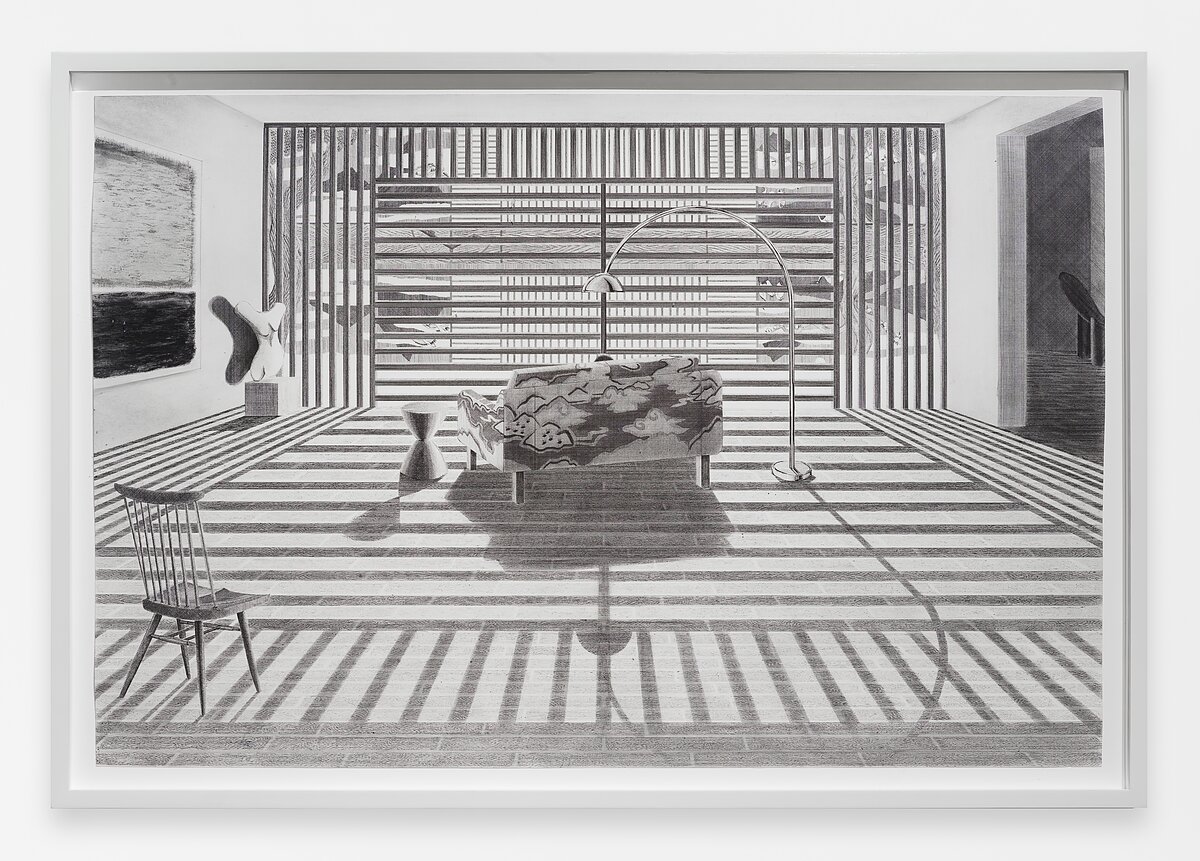 The visual excitement produced by Me’s intense attention to surfaces—the grooves in the wooden chair, the uneven layers of paint on a Rothko painting hanging on the wall, the marbled curves of a limbless sculpture—is heightened by their uniform representation with ink, charcoal, and graphite. The medium is a scrupulous one that connotes knowledge and control. Mysteries of interiority are subjugated to the clinical setting.