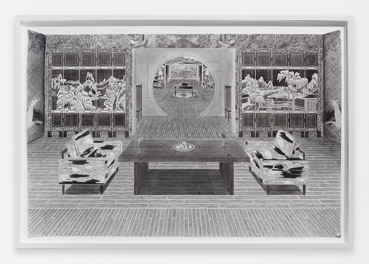 The drawing of Me’s included in “Dwelling” that I like most is Papillon de Nuit VI (2019), which portrays a room that opens into a room, opening into another room. There is a somnambulant claustrophobia to the architecture of endlessly unfolding spaces. Its ambitions are to accomplish an internalization of the external world, to exercise control over a boundless dominion—bids at a self-mastery so thoroughgoing it can only be guaranteed through the total mastery of one’s environs.