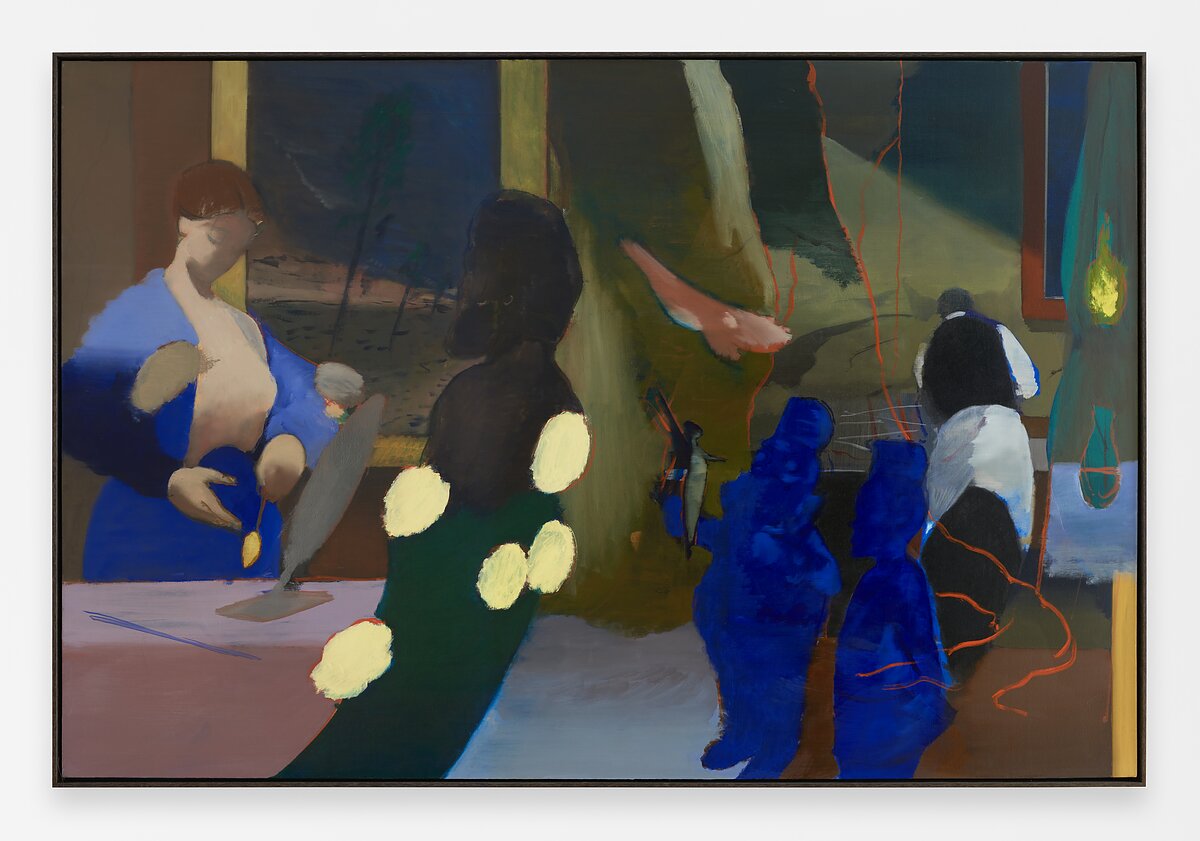 Elsewhere in the exhibition, Kenrick McFarlane’s Untitled (Blue Soldiers) (2021) is a fluid interior less saddled by a sense of confinement. The molten texture of the painting emulates the evanescence of the social scene. For most other pieces in “Dwelling,” a detailed focus on interiors seems to be associated with solitude. Here, instead, the interior—with its liquefying walls, floors, and right angles—is part of the convivial mood, communicating more about the relations between its five occupants than their bodies and faces. McFarlane achieves this atmosphere with a breakdown of lines; the intrusion of pastel blobs and crimson lines; and two stout, expressionistically blue figures bedecked in tophats in the foreground. A woman on the left, talking to a dim figure, fashions something blue in her hands; a butler attends to business on the far right. Behind the woman is either a painting of a few sparse trees in a desert environment or a window. The intersubjectivity of the characters is given priority over their identities, and the sense is that the walls, objects, and colors in the painting speak, too.
