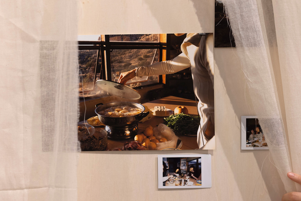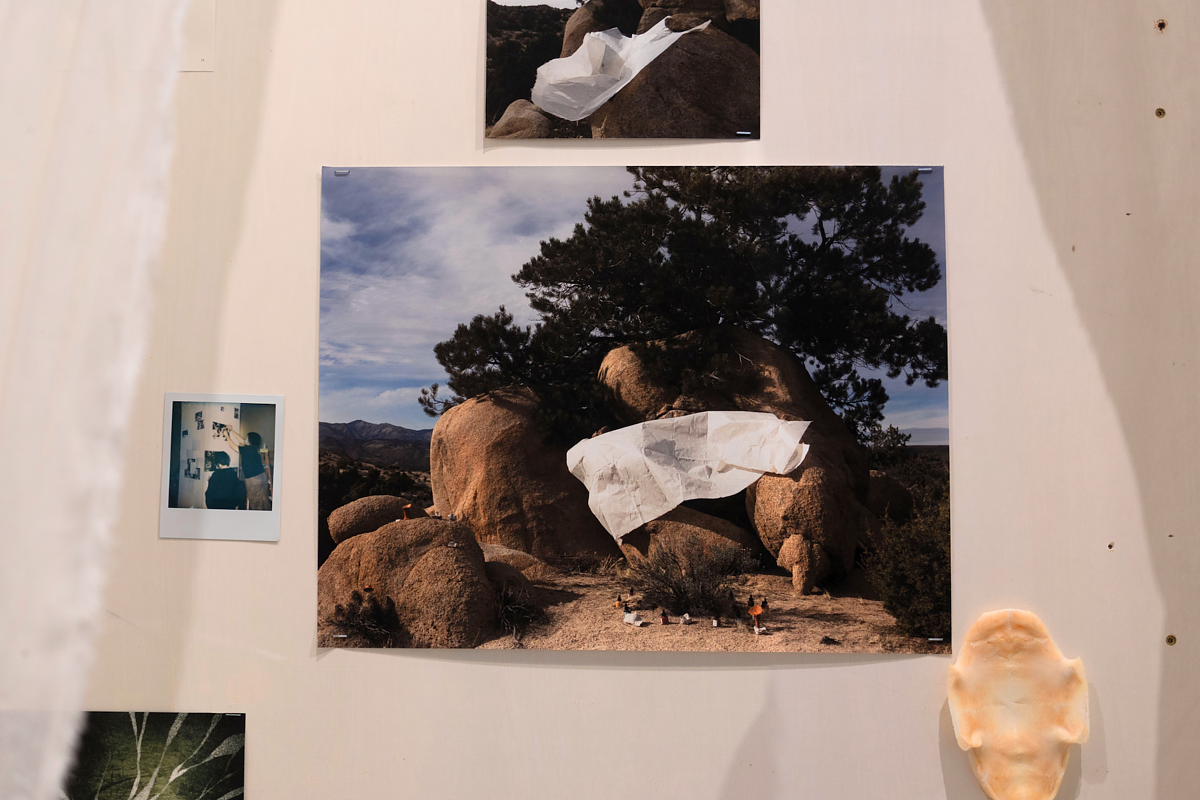 The final installation, the oracles we burn, stands behind the mattresses as two wooden columns covered in community poetry, photos, and drawings. Modeled after steles and couplets found at the entrances of shrines and tombs, the columns are “simultaneously a community archive and a passage into a space of collective memory and queer feminist myth-making”. Delicate yet resilient steamer cloths flutter over each column, protecting and obscuring the community within its embrace while simultaneously inviting onlookers to peek into moments of kinship and intimacy portrayed.