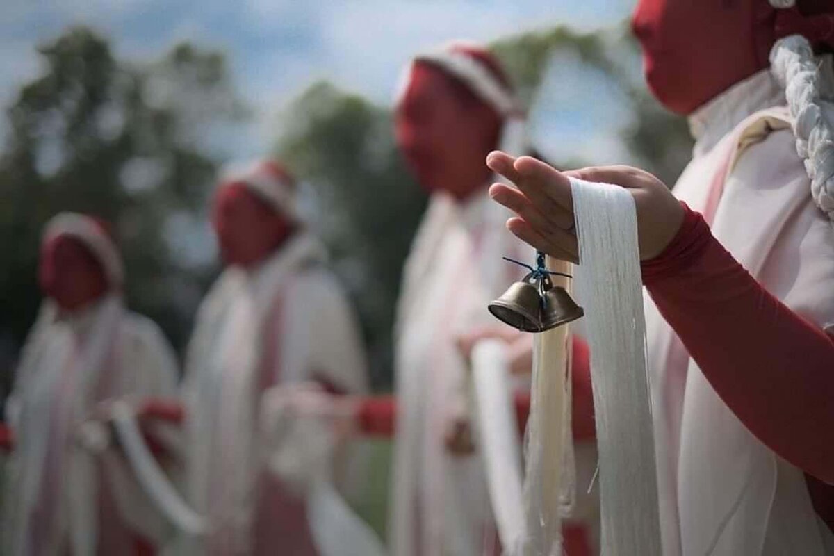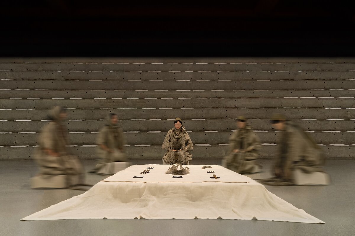Facing the altar is to hold a we, a fabric interwoven with spiritual bells that lay gently above a central mugwort cushion. The fabric is inspired by the silk banner from Lady Dai’s tomb, used in the “calling of the soul” ritual after death. Five kneeling cushions with designs inspired by the five elements of transformation in Chinese cosmology, engravings from buried bronze food vessels, and oracle bone writings from Fu Hao’s Tomb face the central fabric.