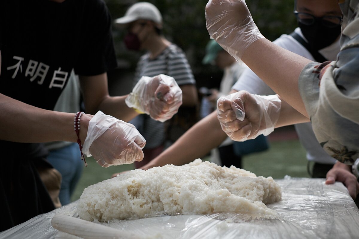The Ciba Punch was performed on the opening night of the exhibition, merging all the mediums and themes of the three installations to transform the site into an active manifestation of collective dreaming, memory-making, and connection into ancestral pasts and communal futures. The Ciba Punch is centered on the traditional Chinese process of making ciba, a type of sticky rice cake. The act of pounding individual grains of rice into a merged final product exhibits the process of collective creation and the possibilities of communal experiences.