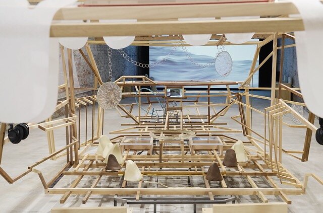 As her narration unfolds, Ro moves around a life-size wooden chassis of a Kia Niro, the same model her father drove on their road trip. Various objects made of steel, ceramic, chain, pewter, and paper mache adorn the car from front to back. The unwieldy installation is soon disassembled into three sections as she drags and pushes each piece across the space. Her struggle to maneuver the towering structure subtly evokes the weight and fragmented nature of her memory and the relationship with her father.