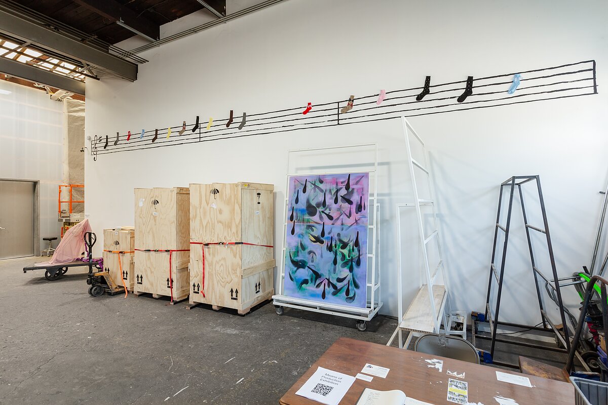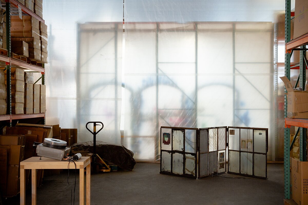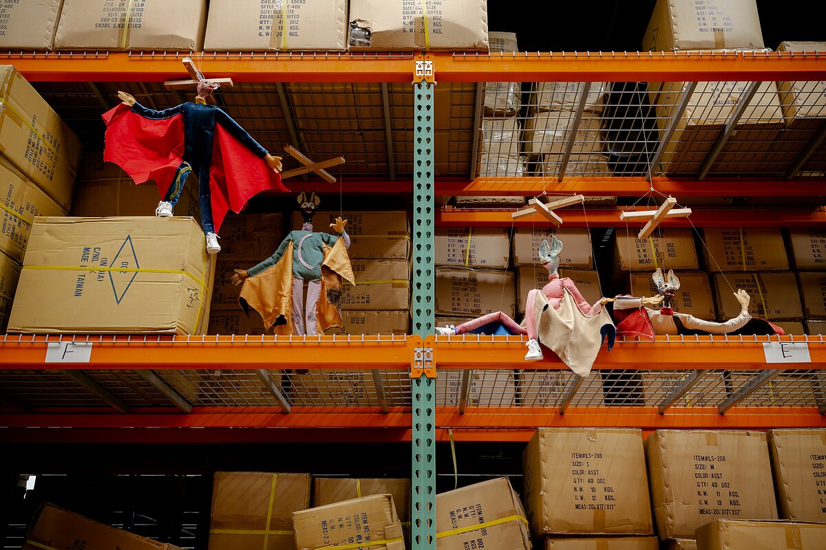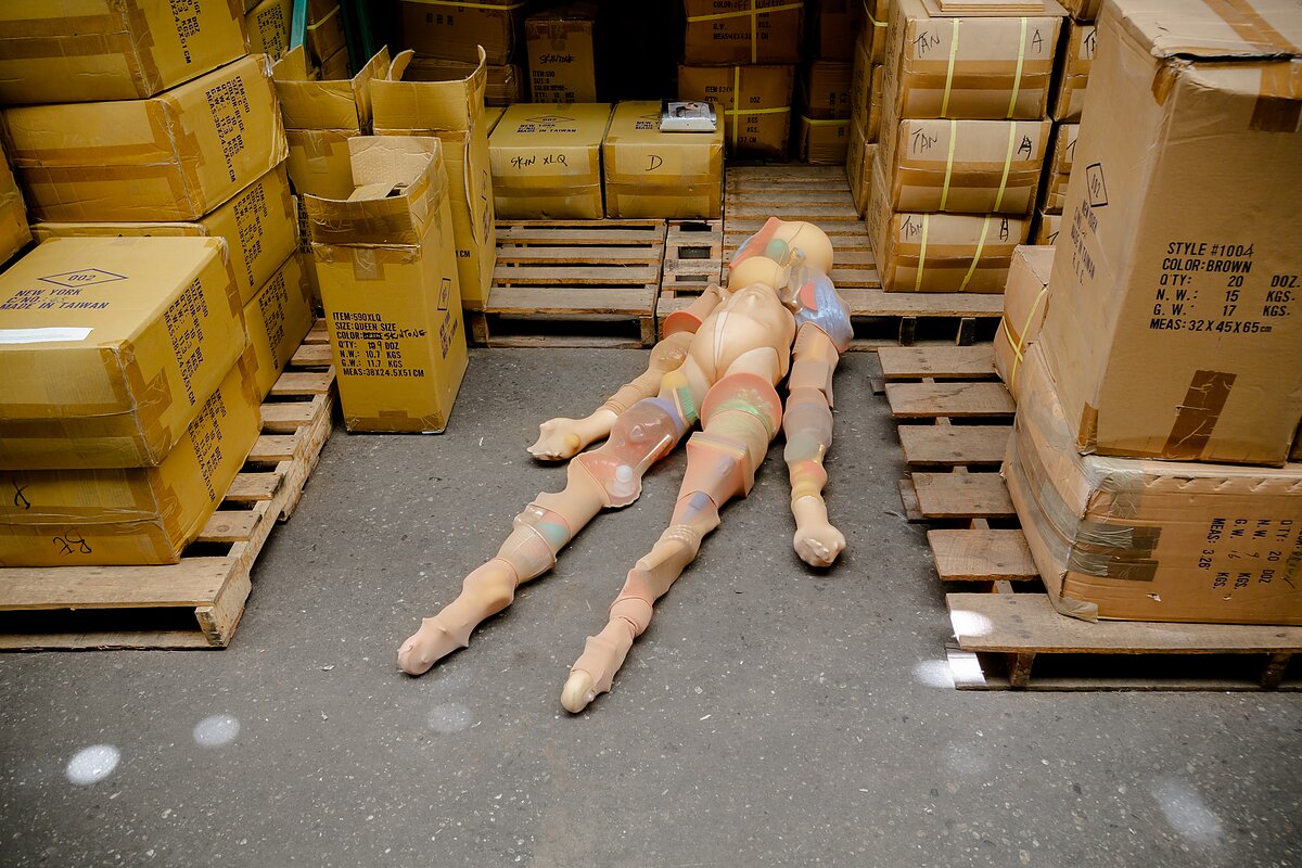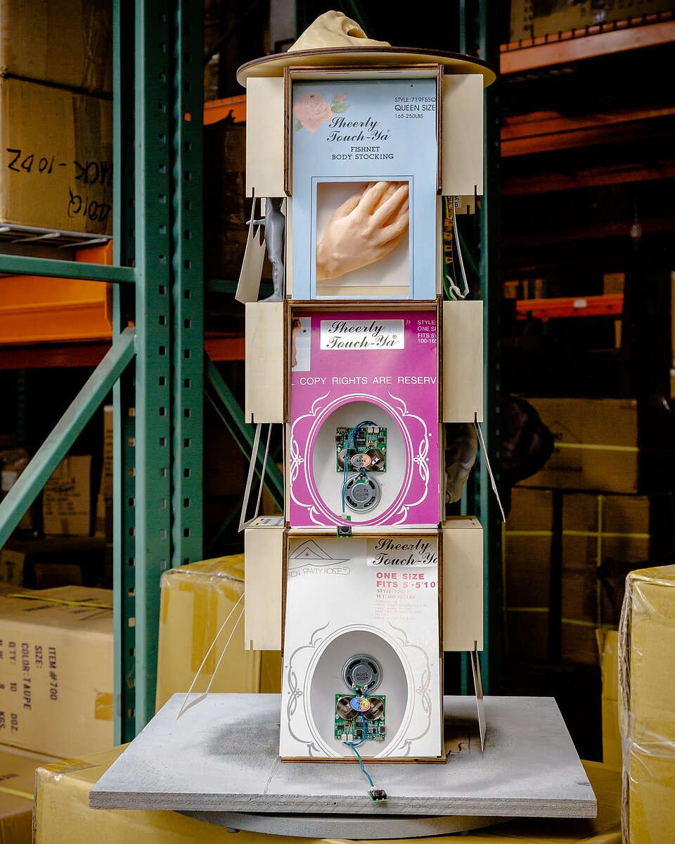 The warehouse—home to Shisanwu LLC, a sculpture fabrication studio, and Sheerly Touch-Ya, a hosiery company owned by artist and Lunch Hour member Serena Chang—showcases the creative labor of around 75 predominantly Asian and AAPI artists on its loading dock. Placed between metal shelves and amid cardboard boxes stacked high on wooden pallets, works adopt the visual language of manufacturing and commerce, absorbing materials like stockings, cardboard, and glass sourced on-site. The result is a blurring of the line between art and commodity, and imbuing the warehouse environment, already a dense web of signification, with new and multivalent symbols.