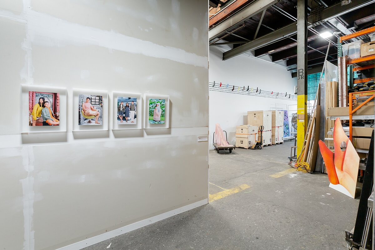 Standout works in “Means of Production” include CFGNY’s Studio Phong (Cao Trí Cu)(2017), a suite of fashion editorials created in collaboration with a Vietnamese portrait studio, which comment on artistic self-representation and the division of labor; Banyi Huang’s Scream Starter Pack (2024), a diorama constructed like an advent calendar with 3D prints of the artist’s body parts and other objects displayed in repurposed Sheerly Touch-Ya packaging, an homage to the physical fatigue of the contemporary artist-worker; and Tianyi Sun’s Dream Skin (Sheerly) (2024), a screen-like sculpture made from lacy Sheerly Touch-Ya tights stretched, in an act of site-responsiveness and recuperation, over the warehouse’s discarded window panes.