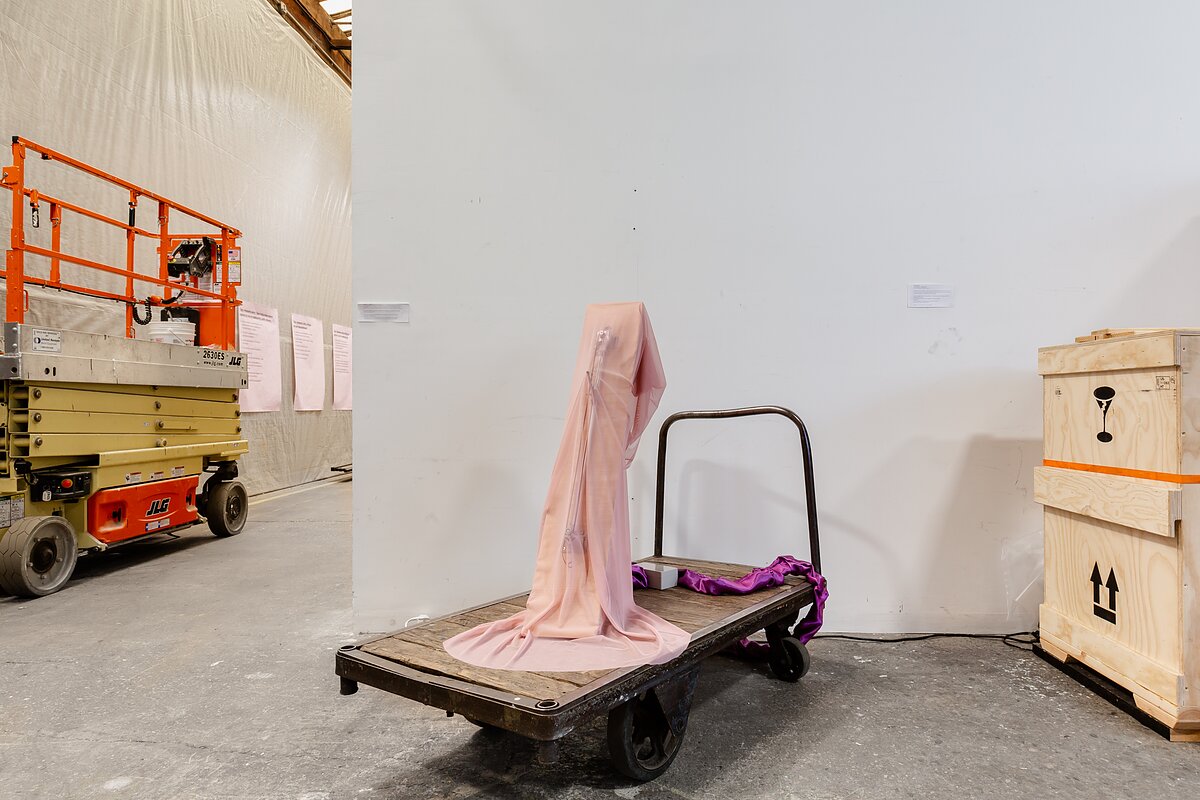 Conversely, “Means of Production” highlights the creative labor of Asian and AAPI artists as a gesture of remediation and solidarity. Several artworks illustrate this principle. Greeting viewers on the loading dock is Koa Pham’s An invitation to a dream (2024), a sculpture made of plywood and aluminum draped in a translucent, pale pink fabric and displayed on a platform cart. Exquisitely obsolete, this vaguely harp-shaped piece of pseudo-machinery is accompanied by an object label quoting a particularly awkward scene in Sofia Coppola’s Lost in Translation (2003), in which a sex worker commands Bob Harris, the film’s white protagonist, to rip her stockings. Bob, confused by her accented English, repeats, “Lip them?” In this brief exchange, sexual and commodity fetishism converge on the site of the laboring Asian body.