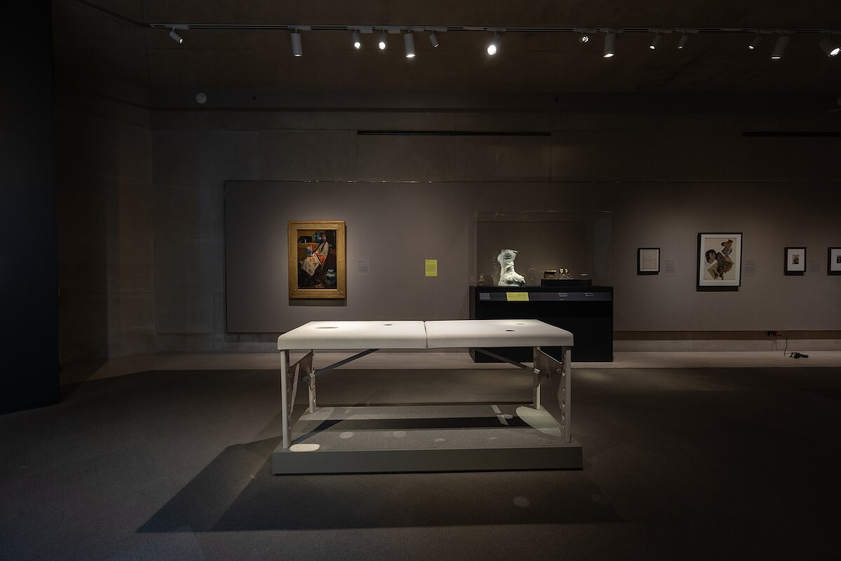 Chang also contributed the exhibition’s final piece, commissioned by Moon specifically for the exhibit—Abyssal: Massage Table (2025), which “recalls the invisible labor of Asian women, including the six Atlanta spa workers murdered in 2021,” according to the wall text. It’s a ceramic massage table with holes carved out of it. The bottom is glazed while the top is not, its rough surface starkly unfinished.