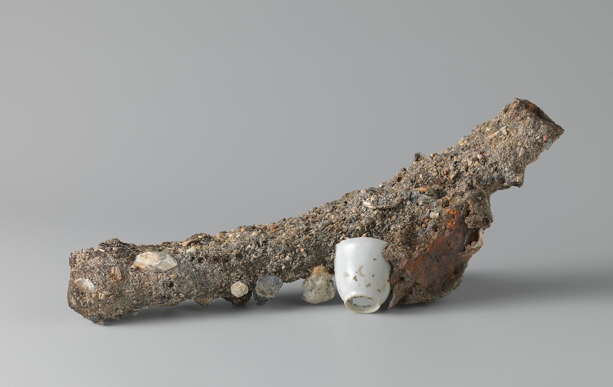 In 1613, the Witte Leeuw (White Lion), a Dutch trading ship, sank in the South Atlantic Ocean while carrying cargo from Asia back to the Dutch Republic. Upon its descent into the sea, a Ming porcelain cup became fixed upon a fragment of the ship, eventually transformed into an artwork by the current and centuries passing, conjoined by decay and new marine life.