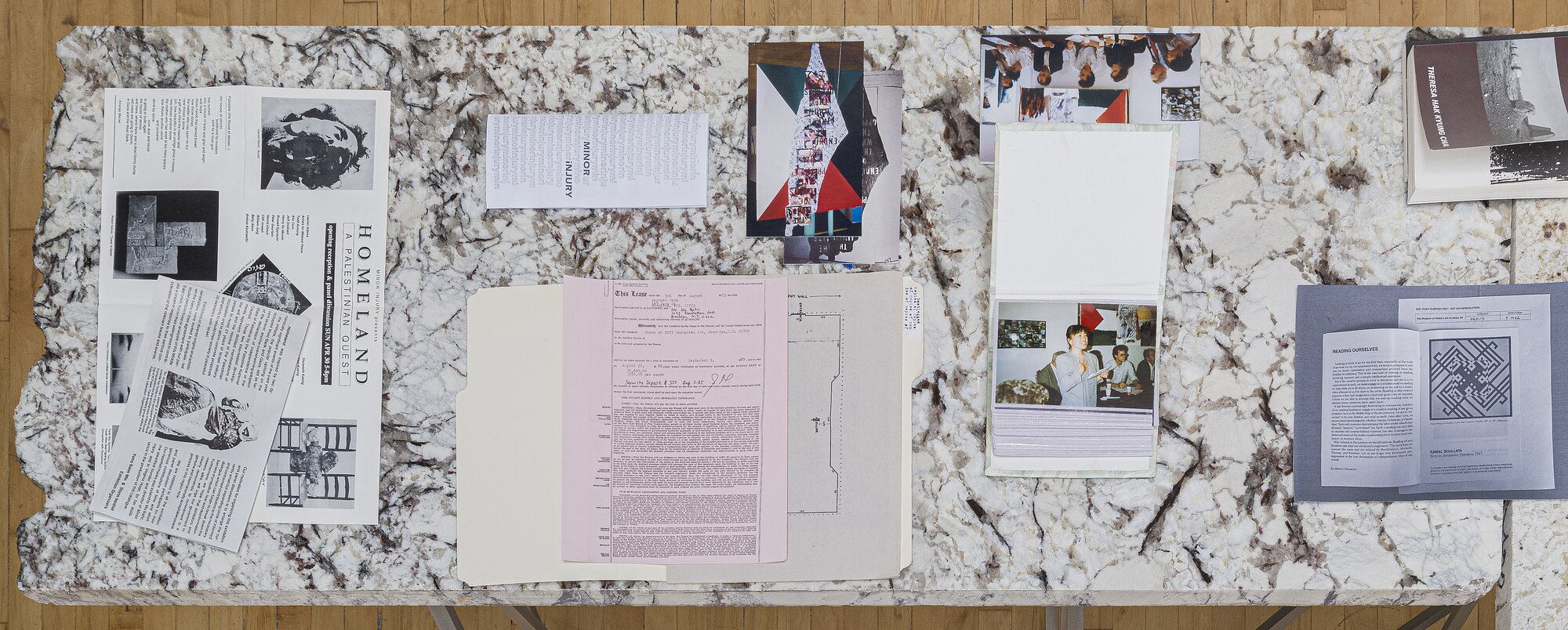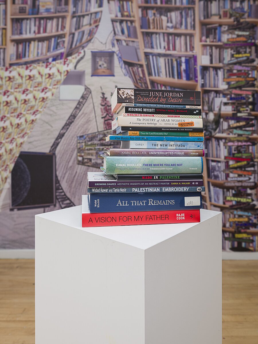 The exhibition “Moving towards Home: Art for Palestine in New York City 1989 & 2024” curated by Jenna Hamed and Amy Kahng at Subtitled NYC for me represents the kind of homage that I would like to see more of. As its title implies, the show revisits a 1989 exhibition, “Homeland: A Palestinian Quest,” organized by Min and Shirin Neshat at Minor Injury—a small Korean American-run space in Greenpoint not entirely dissimilar to Subtitled. In the current iteration, half of the gallery features works by Min, Neshat, and Betty Kano from the original exhibition while the other half displays works by Palestinian American artists Kamal Boullata, Haifa Bint Kadi, Fares Rizk, and Xaytun Ennasr, who were or are currently based in New York City. Between them is a display of reference books and archival material like photographs from Min’s trips to Palestine that visitors are encouraged to peruse.