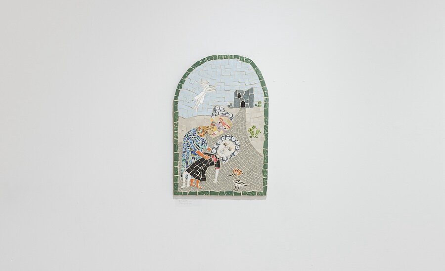 There is another sun and horizon in the work by Xaytun Ennasr, Shrine for the Steadfast (2024). It is composed of two watercolor and ink drawings hung as a pair with two levels of shelving below them. The first holds ceramics containing olive and za’atar branches and the second supports booklets containing a segment from Palestinian poet Mahmoud Darwish’s “Praise of the High Shadow.” The suns depicted in the two watercolors are both golden yellow, but the undulating hills and land are composed of segments, the sections reminiscent of dry earth in a desert, except these patches are jewel toned.