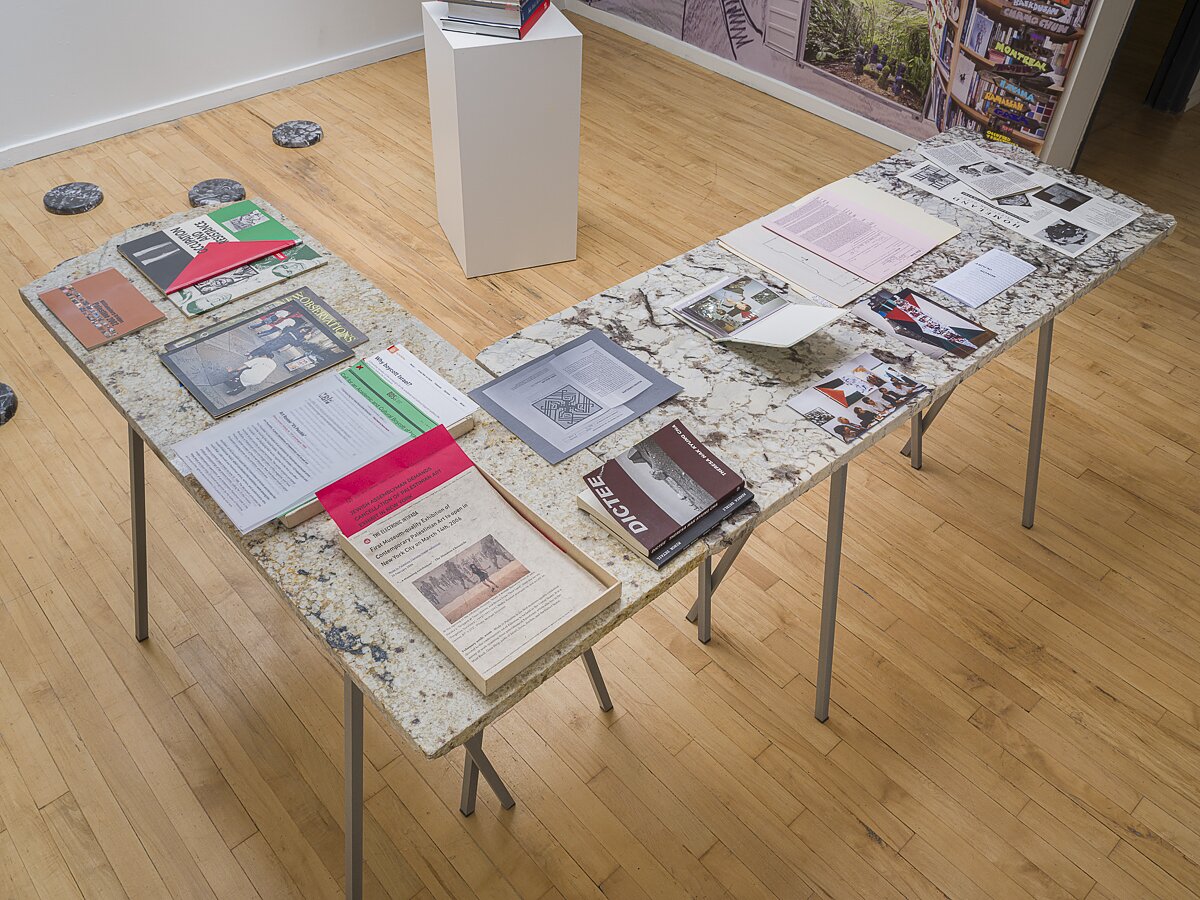 Min’s Mneumonic Journey (2018), a large digital print on canvas that covers an entire wall of the small gallery, could easily overpower the rest of the works on view. Being that the work replicates Min’s personal library containing literature on art, theory, and activism, the work instead appears to host and make space for the other works in the show. Placing Min’s work in this way seems like a generosity on the part of the curators to honor Min’s spirit, regardless of how successful the original 1989 exhibition may have been.