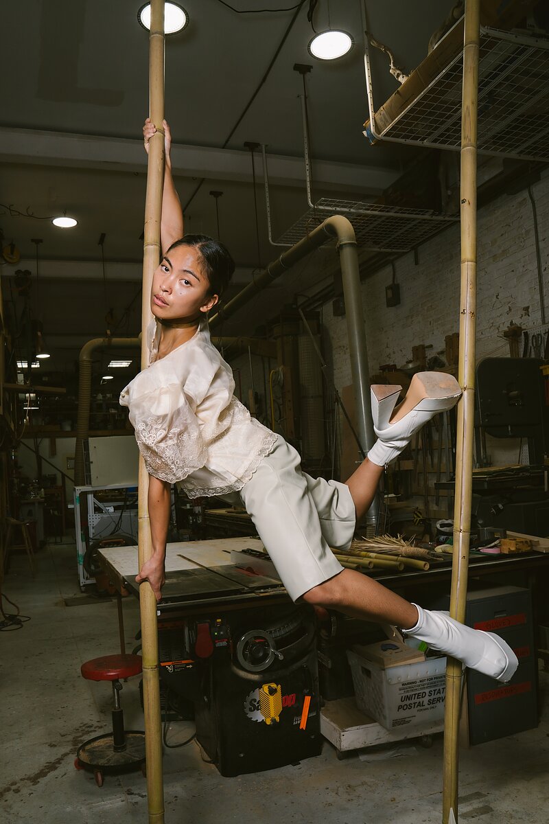 Marie Lloyd Paspe: Pictured with me is a part of the living bamboo sculpture Sabrina Herbosa Reyes and Antonio Giovanni Rivera of Almasphere designed and constructed for our performance installation “bumalik.” The bamboo represents the strength and beauty that grows in the soil of adversity. I climb this sculpture in our work, representing the kapwa (Tagalog for “I and the Other are One”) of a migrant in her search for home.