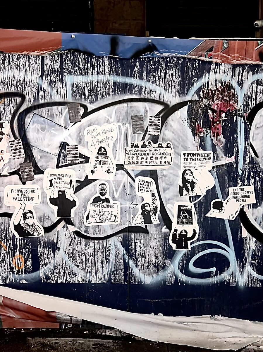I also wanted to select photos that would relate to specific neighborhoods. I chose a lot of photos of Asian Americans in solidarity with Palestine—like W.O.W.‘s banner that reads “From Chinatown to Palestine, No Genocide, No Displacement"—that I put up in Chinatown. In the Lower East Side and SoHo, I used an image of someone holding a sign that says, "While you’re shopping, bombs are dropping.”
