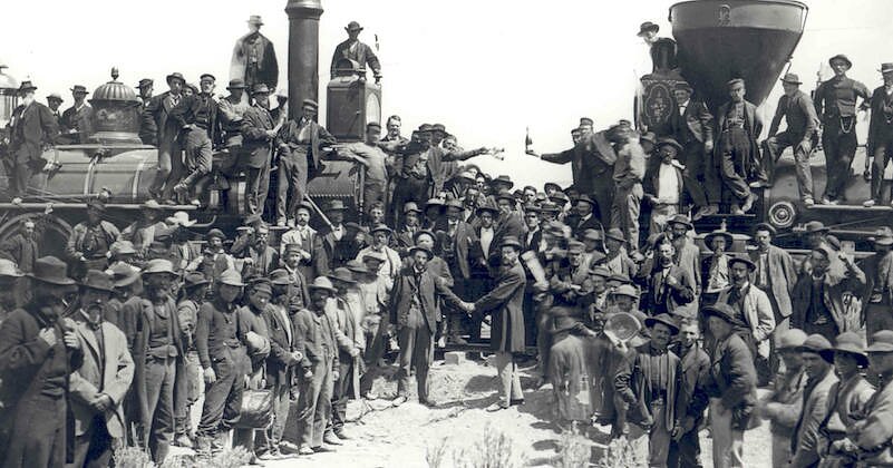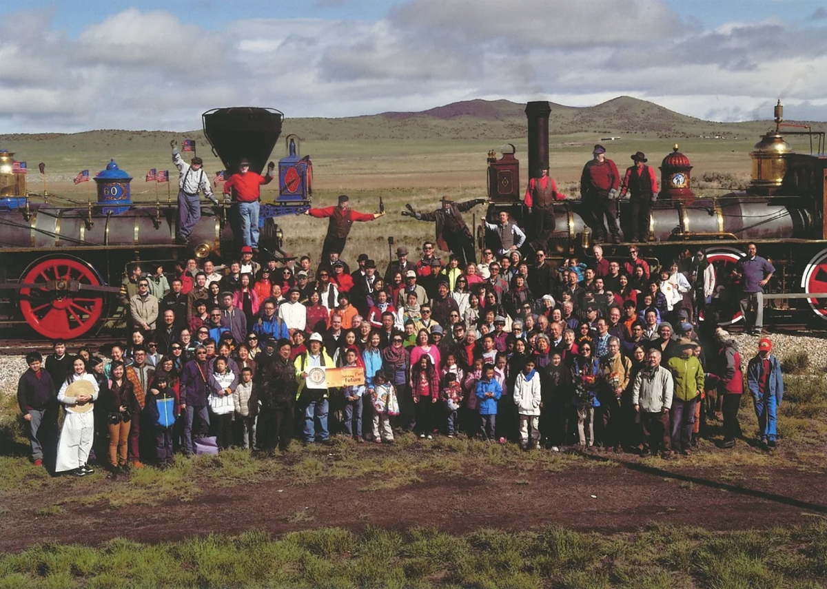 In 2014, Takaki followed Lee to Promontory, Utah, where the First Transcontinental Railroad was completed. Lee’s aim was to recreate the original 1869 commemorative photo which predominantly featured white representatives from the two railroad companies. For this version, however, Lee invited over one hundred Chinese Americans to the shoot to pay homage to the fact that without their labor, the grand project of the American West may have never been realized. It was an act of what Lee would come to refer to as “photographic justice.”