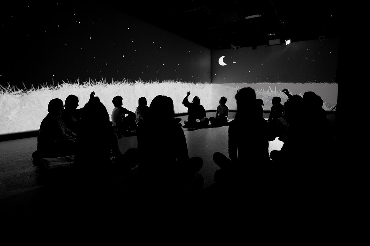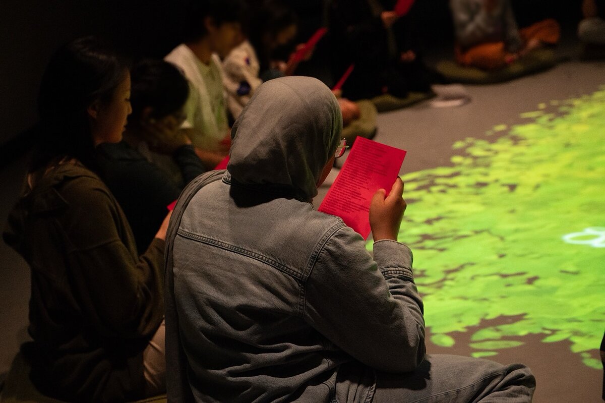 SL: There’s that one scene where the audience touches the ground and a boy emerges from the projection and we’re invited to wave to him before a lily pad emerges and we’re invited to push it across the stage. I thought the mediums through which you presented this play were really effective in inviting the audience to become an active participant within this story of resistance.
