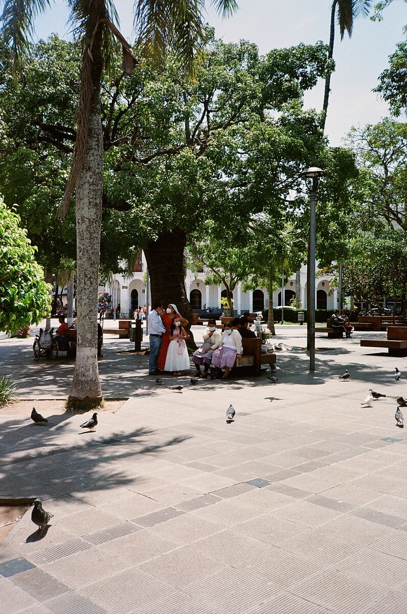 Wandering around the city’s markets, I photographed the rich Indigenous cultures on display representing the Aymara, Quechua, Chiquitano, Guaraní, and Moxeño communities. We ate salteñas, Bolivia’s famous baked empanadas with a savory soup filling, and mocochinchi, a refreshing, caffeine-free tea made from dried peaches, cinnamon, and clove. Throughout the vibrant colors and artistry, stray dogs roamed the streets and panhandlers were everywhere.
