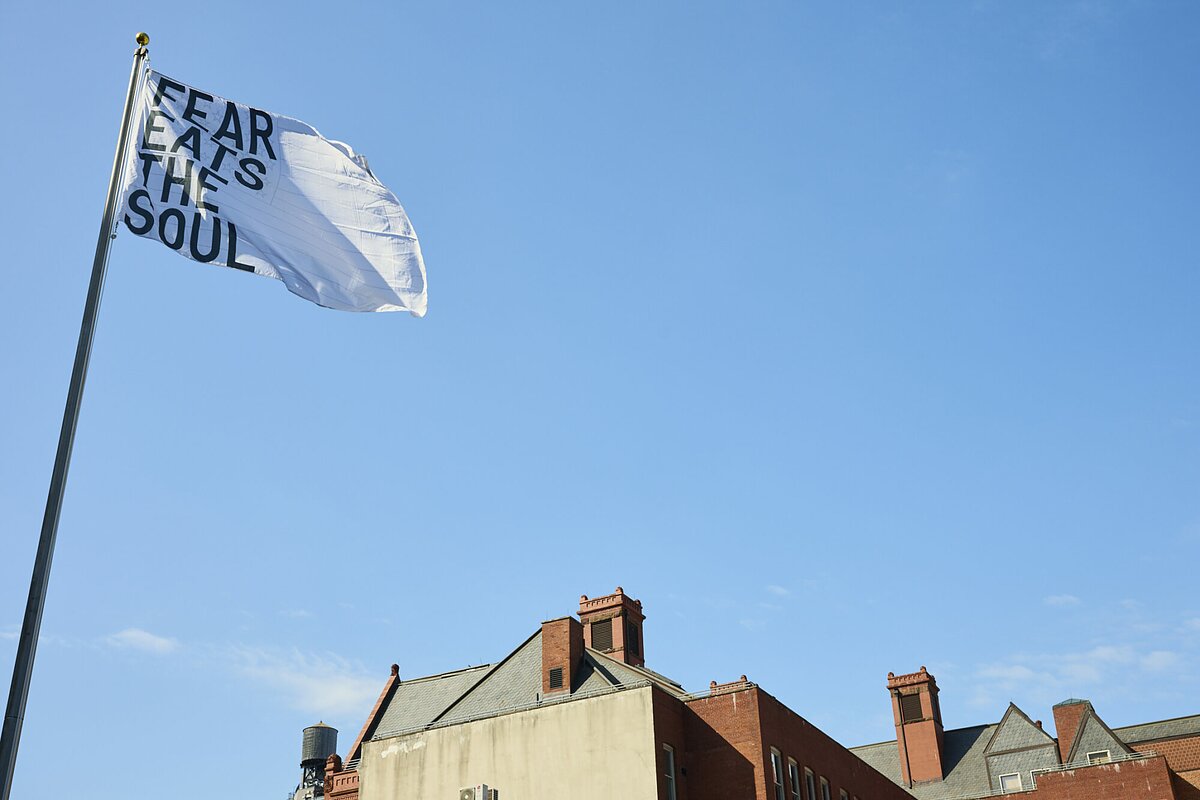 Flying high above the cold concrete walls of MoMA PS1 is a raised white flag that reads “Fear Eats the Soul”, a text that feels uncomfortably urgent given our current moment in history. This is likely the first work of Rirkrit Tiravanija’s that visitors will encounter when visiting, “Rirkrit Tiravanija: A LOT OF PEOPLE,” the largest exhibition of his work to date.