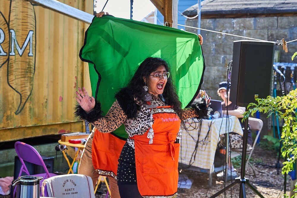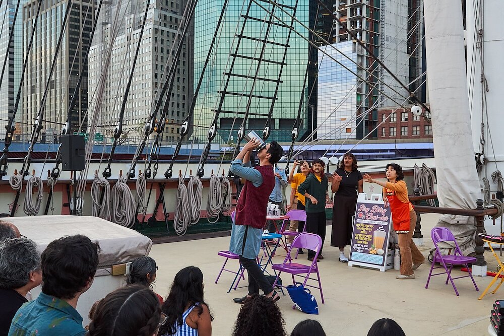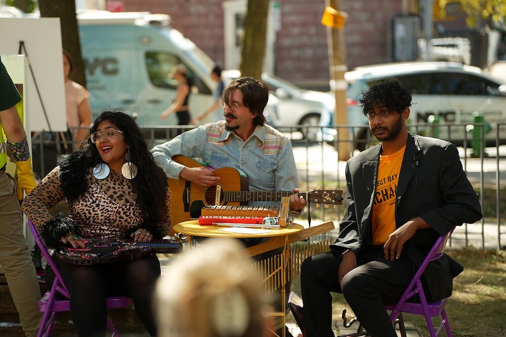 Recognizing that these neighborhoods have been historically overlooked in disaster planning efforts, Unni designs performances with non-English speaking, intergenerational audiences in mind—more specifically, the affectionately-termed South Asian “aunties” that she grew up gossiping with. This spring, she brought FSA to community hubs—including chai shops and public parks that non-English speaking residents often frequent—in immigrant enclaves like Richmond Hill, Jackson Heights, Floral Park. “We’ve gotten to perform on boats and community farms and libraries and all genres of public space, which has been really gratifying,” Unni said.