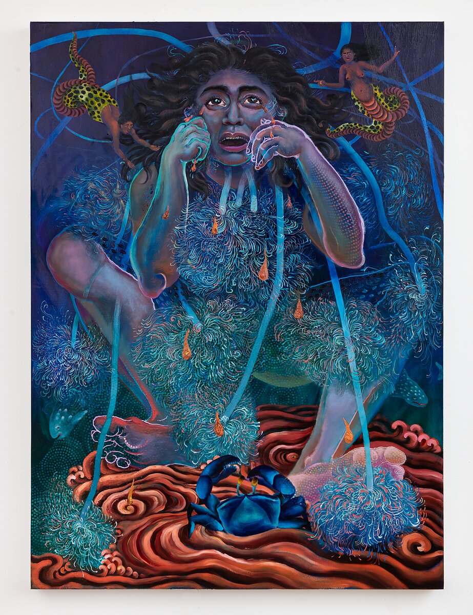 It’s impossible to put Sahana Ramakrishnan in a box–she contains multitudes. An avid practitioner of Muay Thai, the India-born, Singapore-raised, Brooklyn-based artist underwent knee surgery earlier this year and began this 14-piece collection as a way to heal her mind, body, and spirit. Ramakrishnan’s first solo show at Fridman Gallery takes us on a mystical, mythical journey through space, matter, and time. Stepping into the bright, airy exhibit, one is transported to a realm where the past, present, and future collide in “An Ocean of Time.”