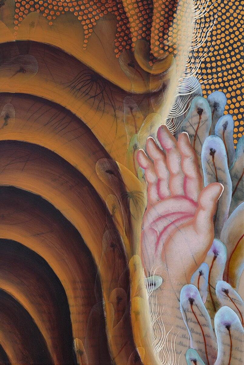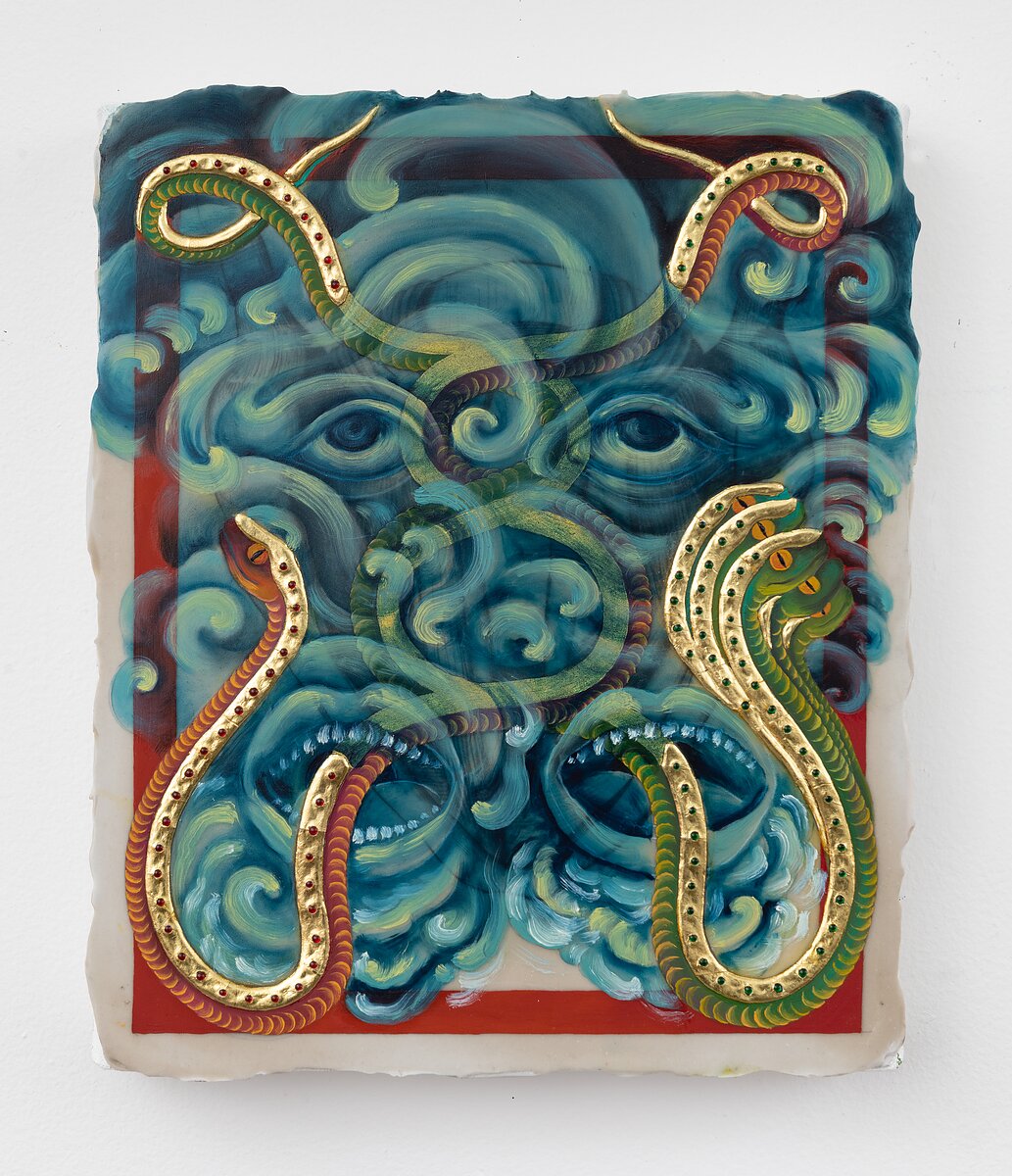 Snakes, spirals, and cords of rope sewn into canvas in works like Portrait of a Tree (2023) and Song of the Naga (2023) all represent movement, wholeness, and transition. Written mantras, embedded beneath hypnotizing kaleidoscopic motifs, inject dimension and juxtapose Buddhist chants with verses from William Blake’s Songs of Innocence and Experience.