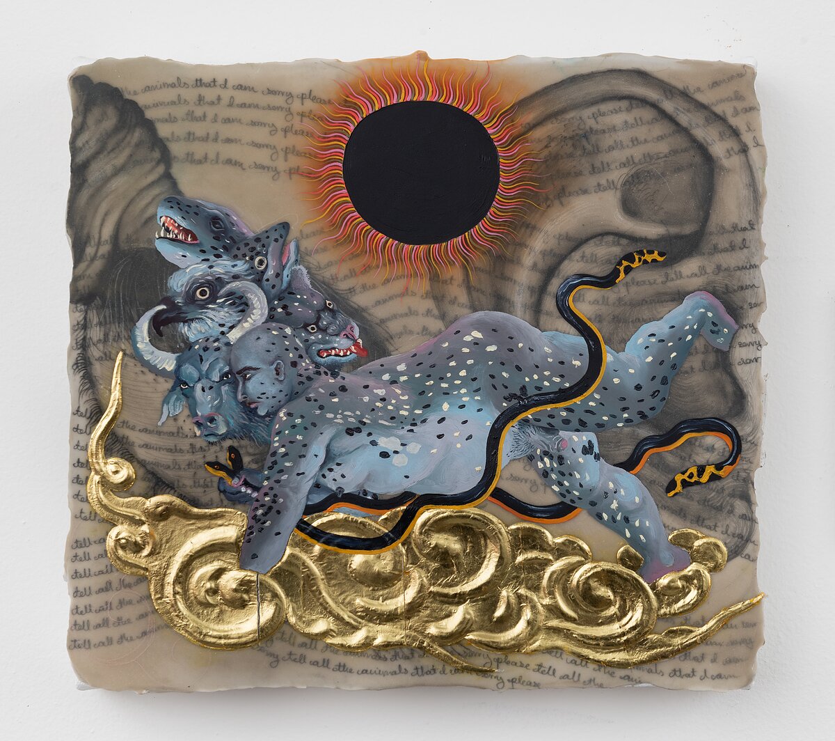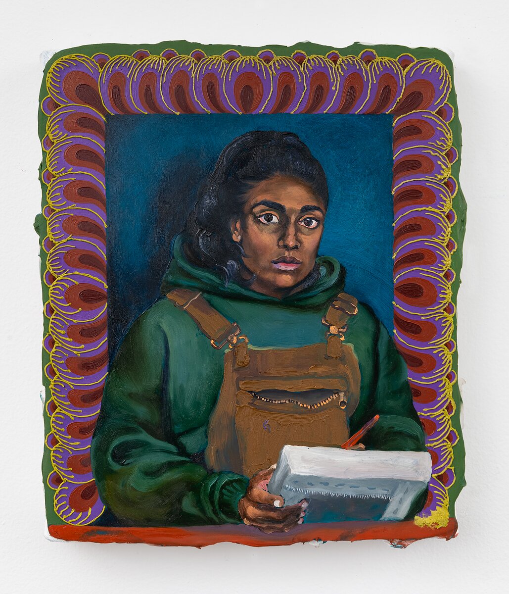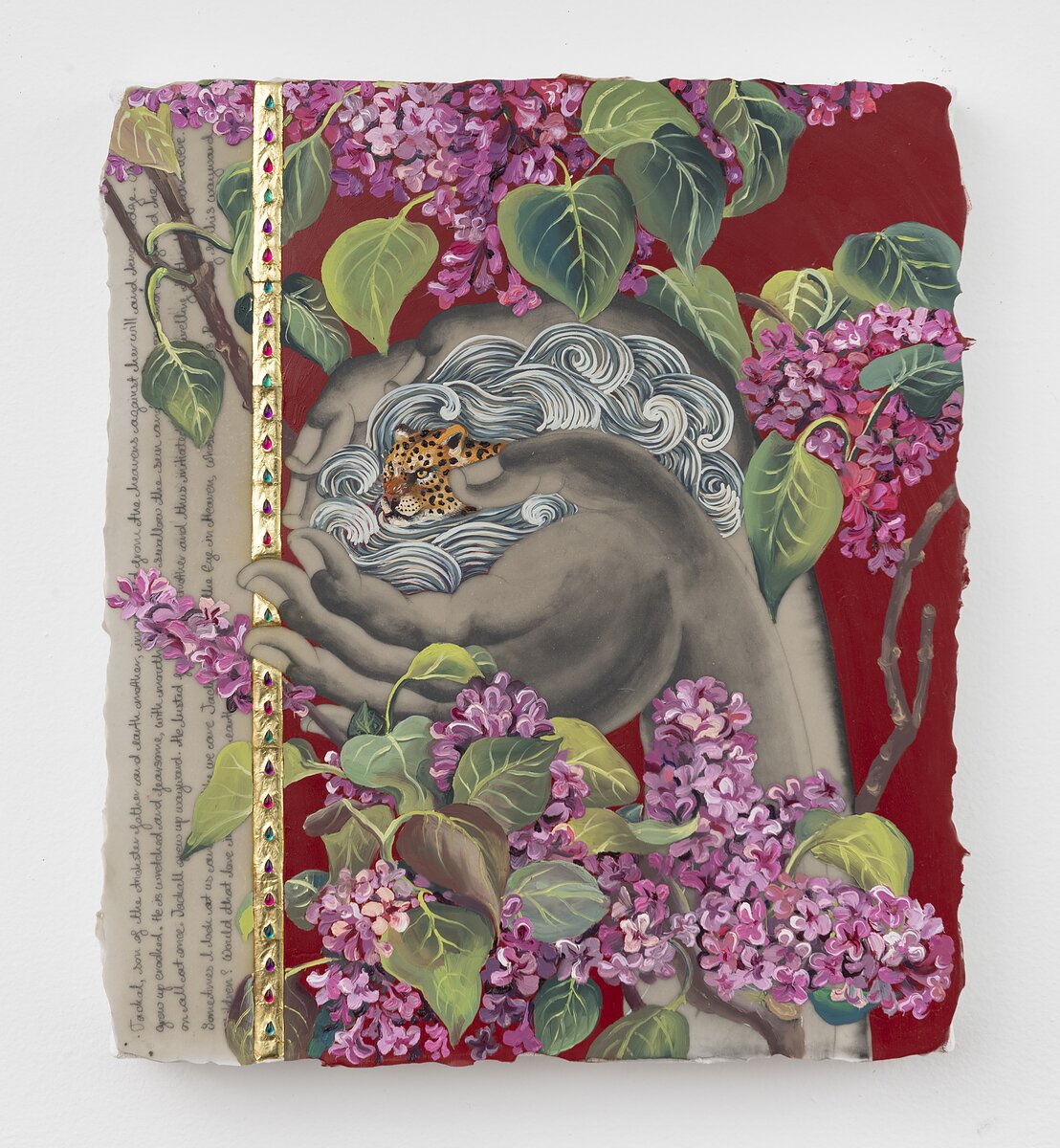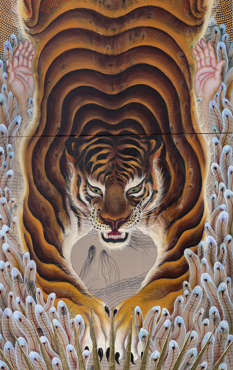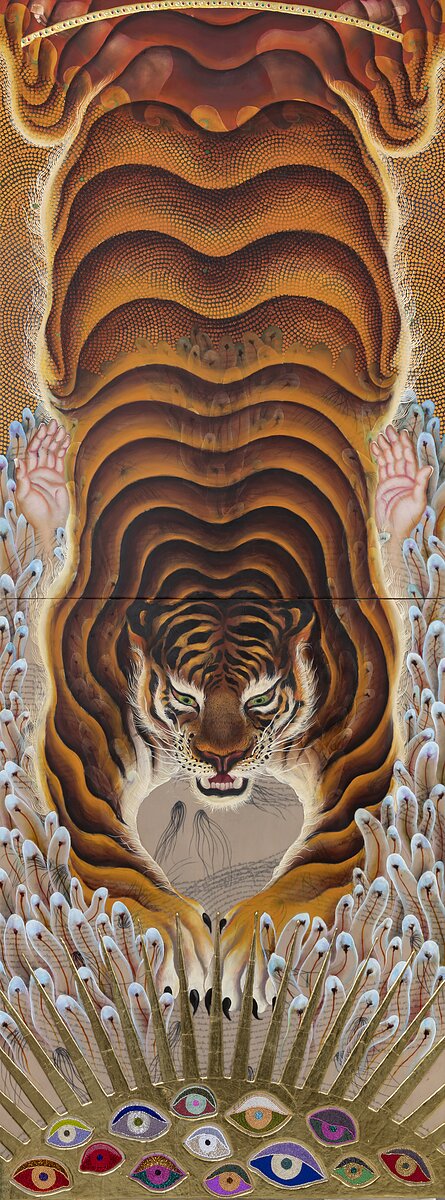 At the center is The Closing (2023), an 80” by 30” diptych of a boundless tiger painted on a wooden panel using cascading layers of oil, graphite, and sumi ink, topped with seed beads, gold leaf, and rhinestones. Following is the scaled-down Self-Portrait (2023), a printer-paper-sized oil painting on canvas, reminiscent of portraits once seen in royal households with its foreground composition and rich jewel-toned colors.