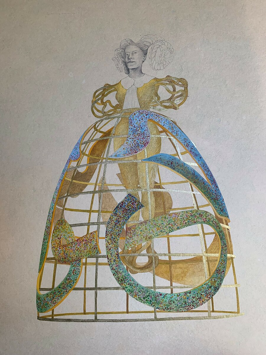In Witness, the feminine form is buoyant, supported by the skirt at the waist, rising upward, breaking through the symbolic glass ceiling.