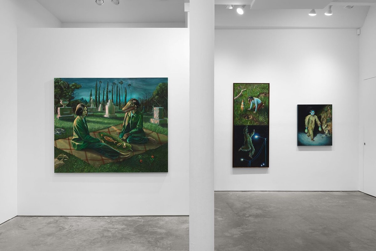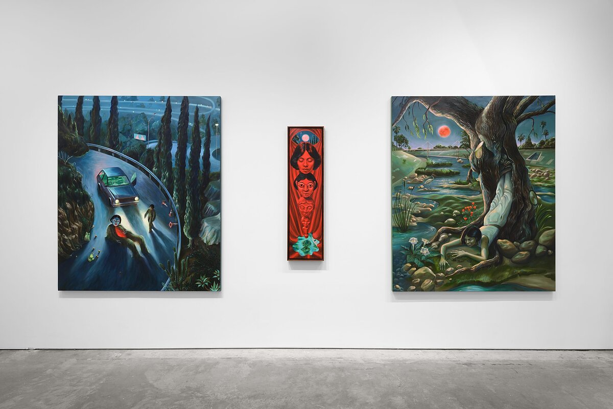 Golden’s work reflects this notion of an unfixed identity. Through her work, she is on a quest of discovering the infinite layers within her current, previous, and future versions of self via a visual, narrative language of painting. In her 2022 series, “Incarnation,” Golden presents herself as a more self-confident figure that tries to confront Mahasona while self-identifying with him at the same time. Originally displayed at the Miki Meng / Friends Indeed Gallery in San Francisco, the series sees Golden confronting the demon in a graveyard, car park, forest, hill, and lake against the Los Angeles city skyline, reflecting her recent move from New York City.