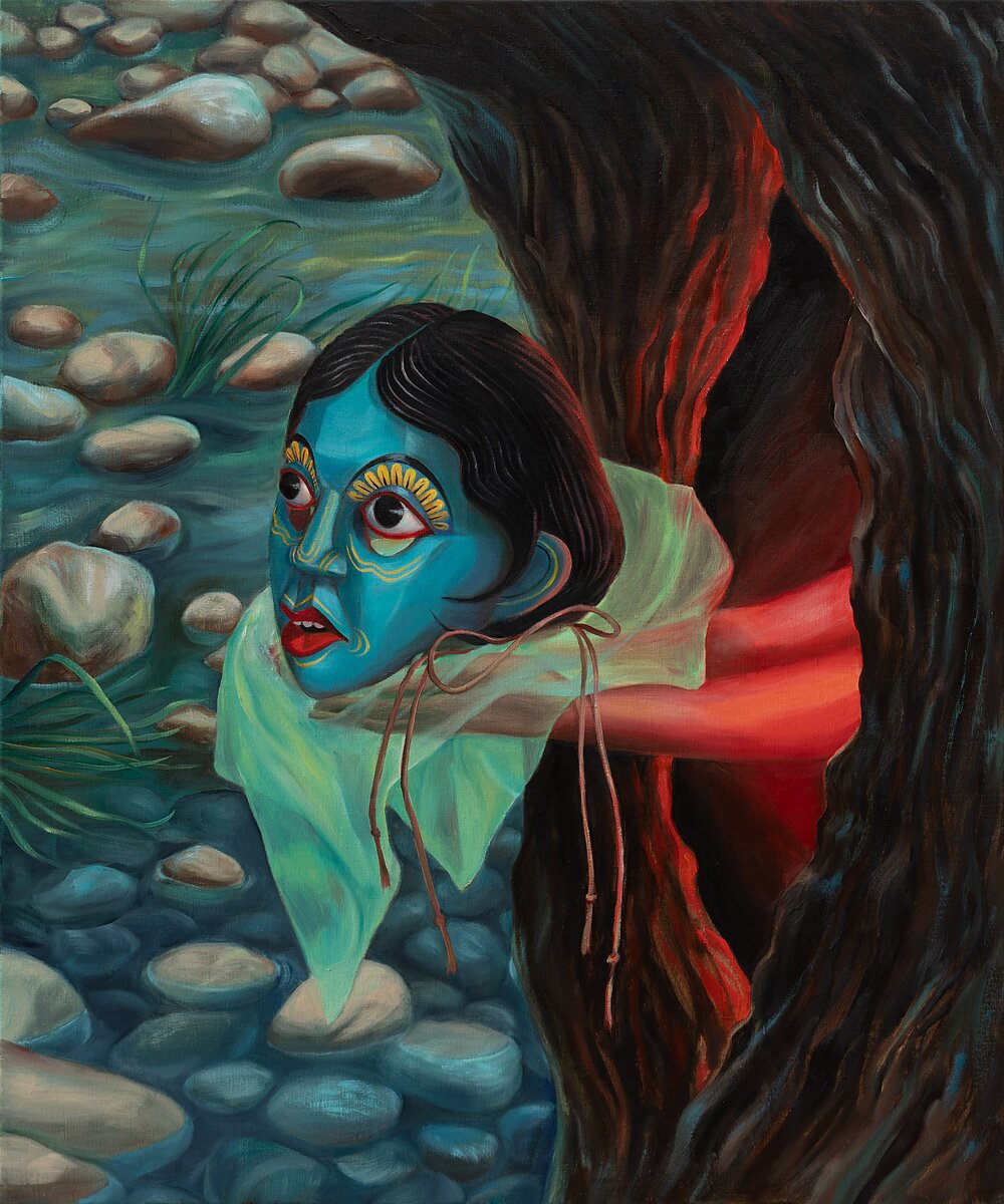 When asked about her use of masks, whether of mythological demons or her own creations, Golden describes a need to understand herself through her own characteristics. While the ritualistic, the afterlife, and cityscapes continue to be external forces that define her, she remains more interested in the internal forces within her. Golden’s pluralistic, infinitely layered approach to the self is reminiscent of the postcolonial woman described by filmmaker and writer Trinh T. Min-ha in her 1989 text, Woman, Native, Other. Min-ha writes, “‘I’ is […] not a unified subject, a fixed identity, or that solid mass covered with layers of superficialities one has gradually to peel off before one can see its true face. ‘I’ is, itself, infinite layers. Its complexity can hardly be conveyed through such typographic conventions as I, i, or I/i.”