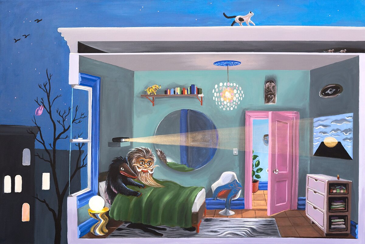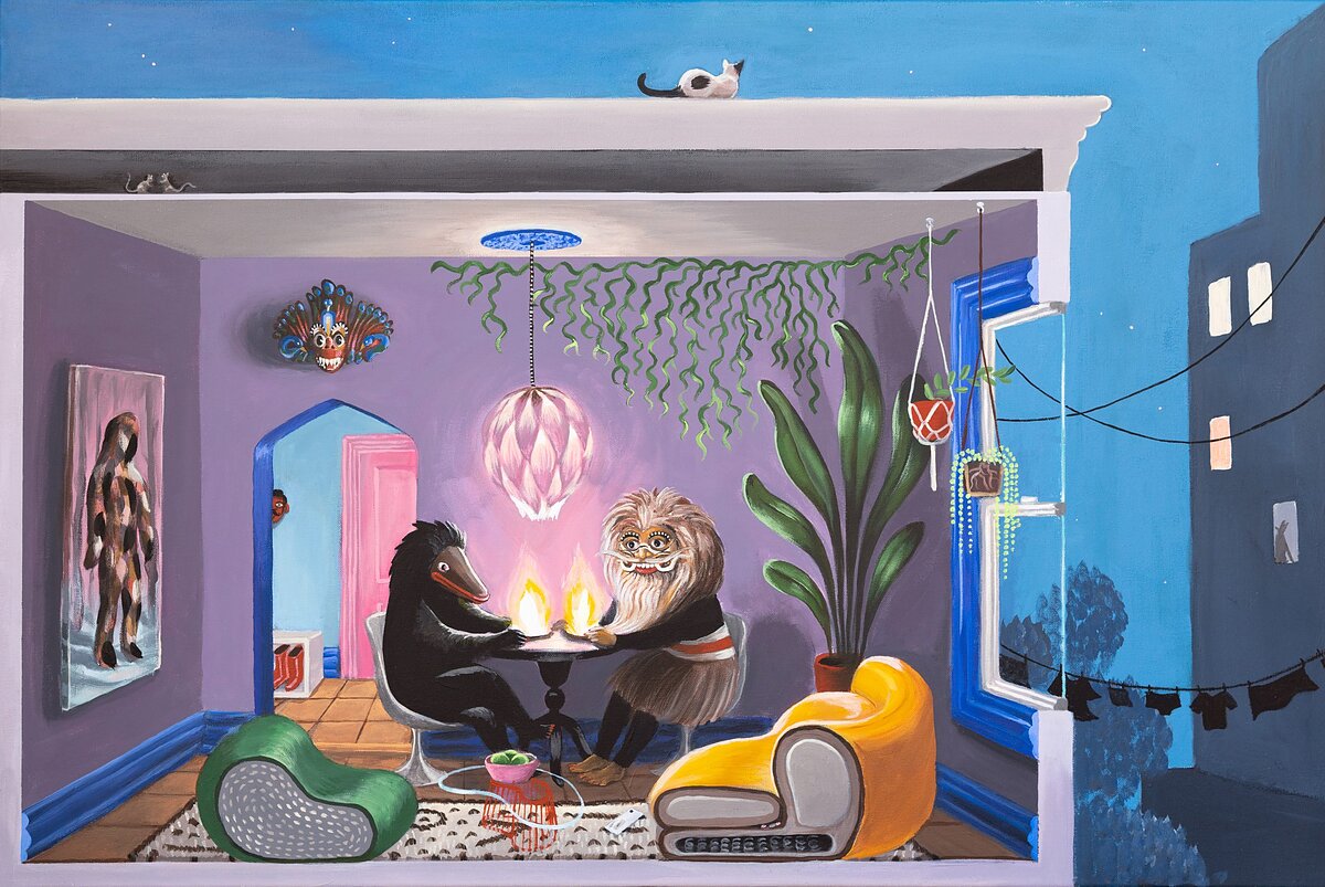 One of the first demons Golden was drawn to for inspiration was Mahasona. The diptych Rooms from 2018 depicts herself as the 122-foot-tall demon of graveyards. Bearing the head of a bear, its four eyes can afflict illnesses like cholera or dysentery on its victims, crushing their shoulders, and possessing them. Golden’s partner is depicted as Reeri Yaka, who is the second most powerful demon in Sri Lankan mythology. Typically shown with a fiery, red-skinned human body and the head of a monkey, there are 16 apparitional versions of Reeri Yaka that can condemn people to blood diseases and hemorrhage.