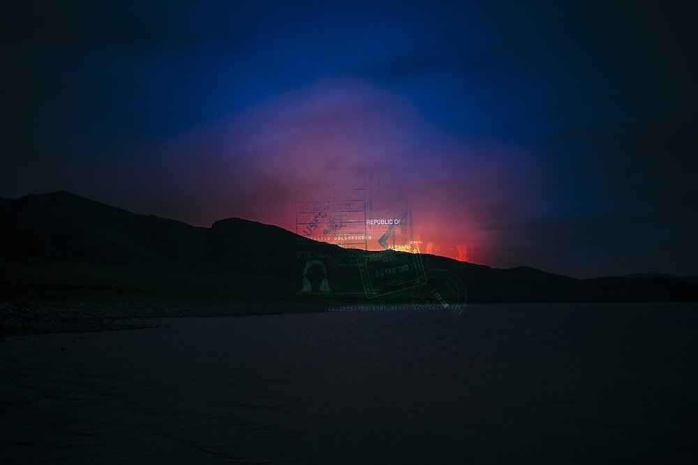 For one photo, I aligned the borders of the passport page with the borders of the image, as if expanding the landscape. In another, I placed the pattern of sun rays from the passport into the sky, just playing with the textures. I also placed some bureaucratic terms from the customs stamps onto the photos, for example “Change of purpose not allowed. No work for business,” punctuating the images with the bureaucratic restrictions and orders one might encounter while transiting from one place to another.