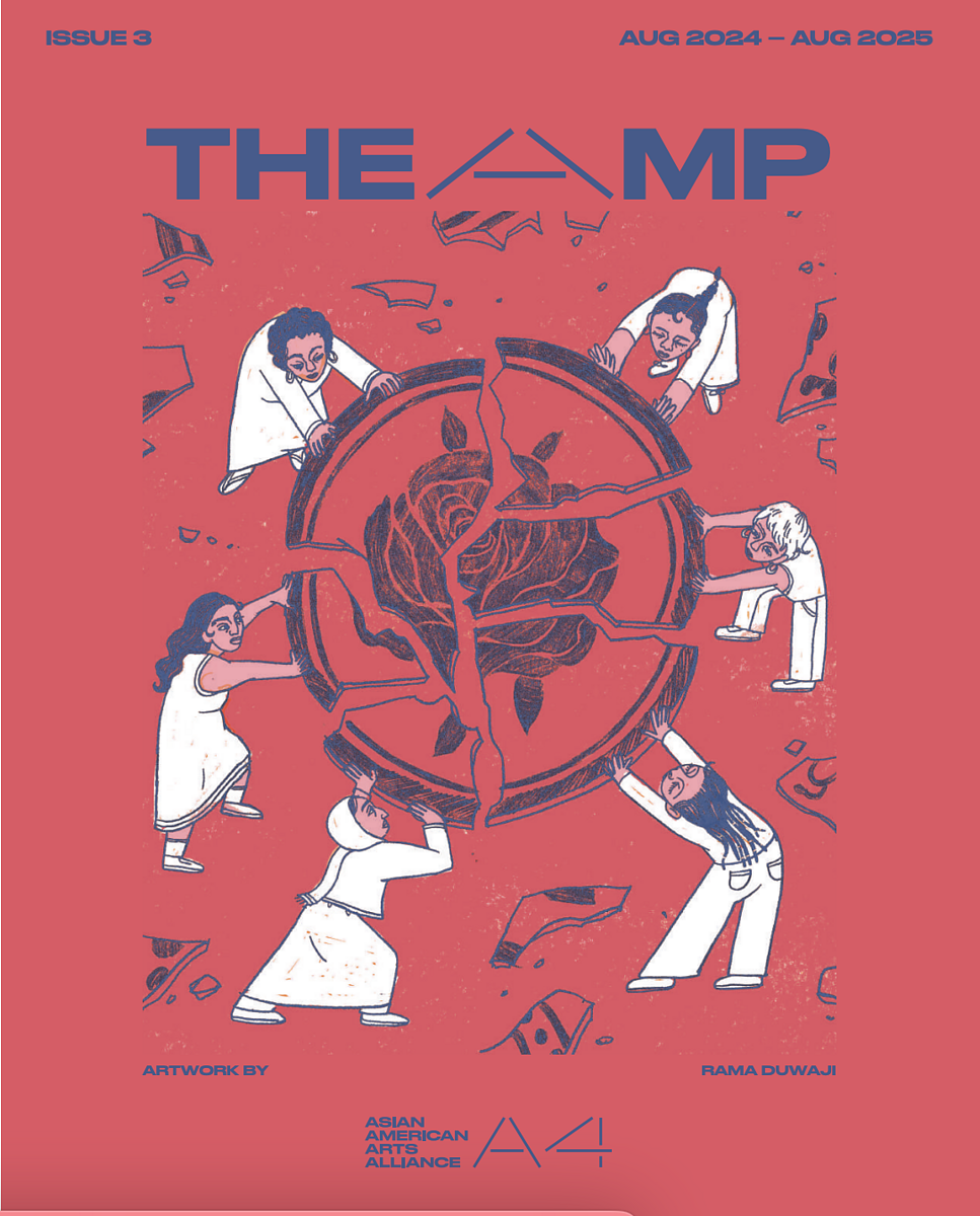 As always, I’d like to thank our ever-growing community of contributors, artists, readers, and supporters who continue to deepen, challenge, and expand what it means to be Asian American. I’d also like to thank my colleagues at Asian American Arts Alliance, Lisa Gold, Michelle Bae, Leo Chang, Justine Lee, Stephanie Shin, and Danielle Wu; this year’s Amp intern, Lajward Zahra; our print issue designer, Helen Chen; and our printers, Lucky Risograph.
