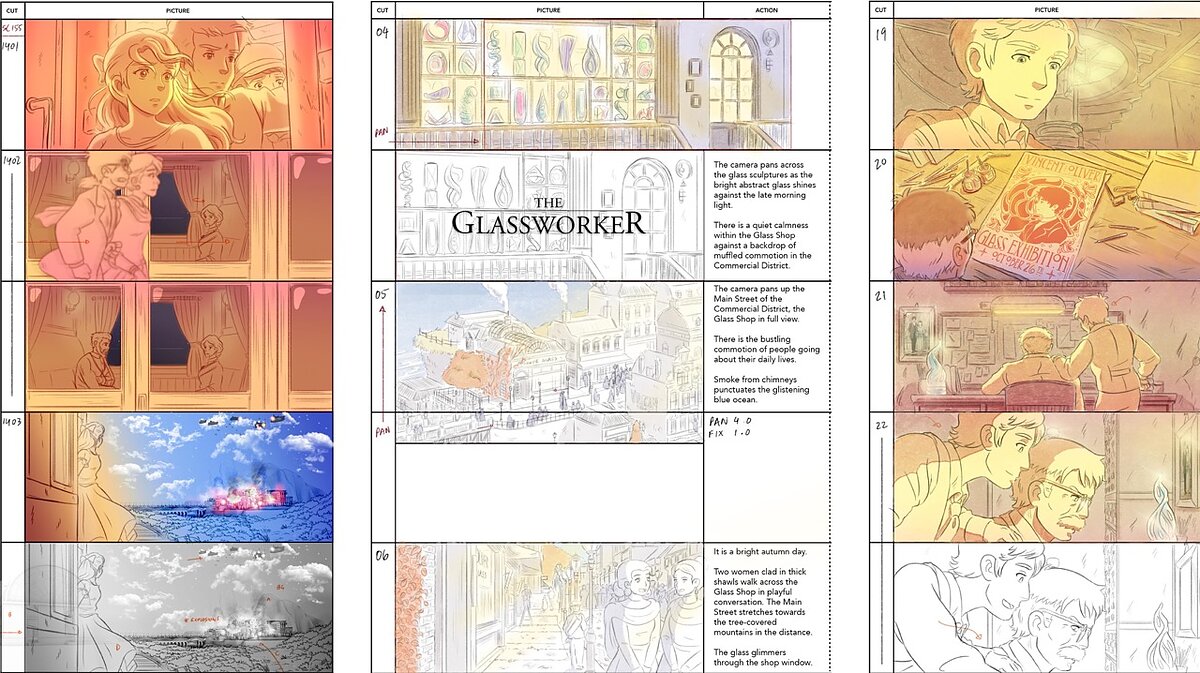 UR: I didn’t start with the script. I started with image boards. I started drawing this father and son in their workshop, making glass, with the idea that a war is surrounding them. But it’s just these two characters in their own little world making their art form.