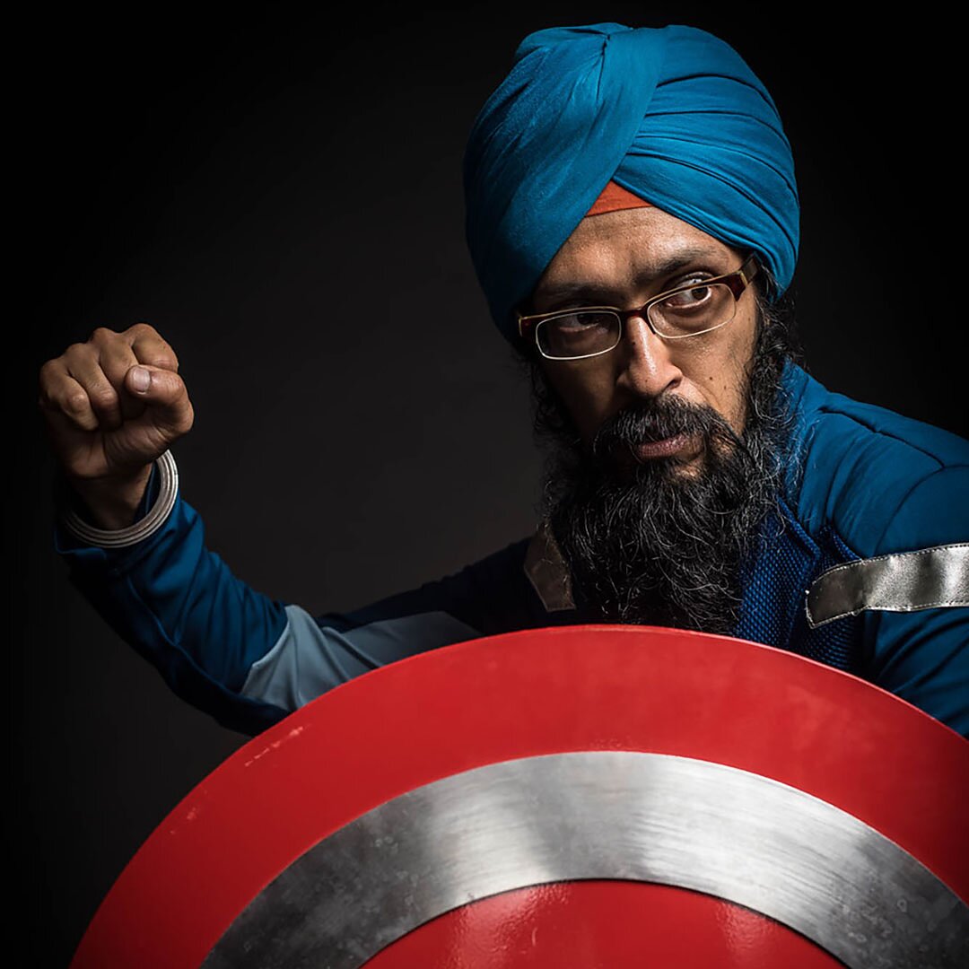 Not all heroes wear capes—but cartoonist, author, and activist Vishavjit Singh does, along with a turban, beard, and a Captain America costume shipped from Hong Kong. Motivated by the sustained Islamophobia that persisted in the wake of 9/11 (as well as the popularity of the Captain America film franchise), it was twelve years ago that Singh first appeared on the streets of New York City dressed as a Sikh Captain America.