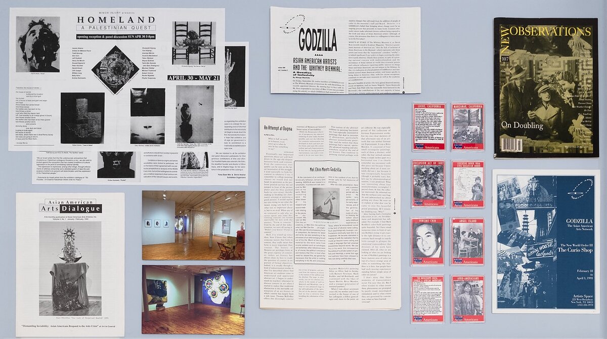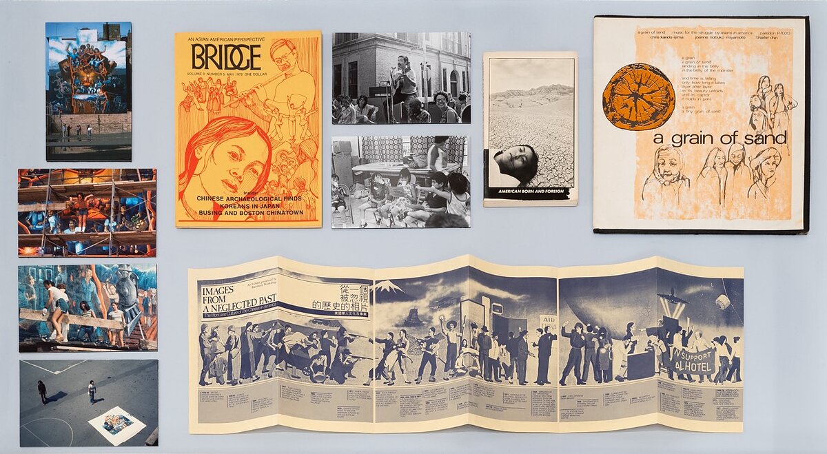 As a label, Asian American was and remains a convenient signifier of kinship around which people might unite and organize. Artworks and archival material attest to the community-building efforts of groups such as Basement Workshop, Godzilla, and the still-active Asian American Arts Centre. Basement Workshop, which supported residents of Manhattan’s Chinatown from 1970 to 1987 through social services and cultural programming, also scrutinized Americanness and “foreign” identities through its exhibitions, widely circulated publications like Bridge Magazine, music, and other creative outlets.